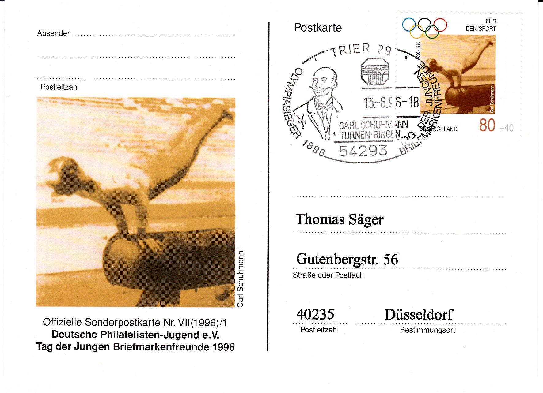 1996 erschien in der Zuschlagserie der Deutschen Bundespost zu den Olympischen Spiele 1996 mit Olympiasiegern ein Wert mit Carl Schumann am Sprungpferd. Dieser Wert ist hier mit einem Sonderstempel zum Tag der Jungen Briefmarkenfreunde am Ausgabetag der Marke in Trier 29 mit einem Sonderstempel mit einem Kopfbild von Carl Schumann abgestempelt.