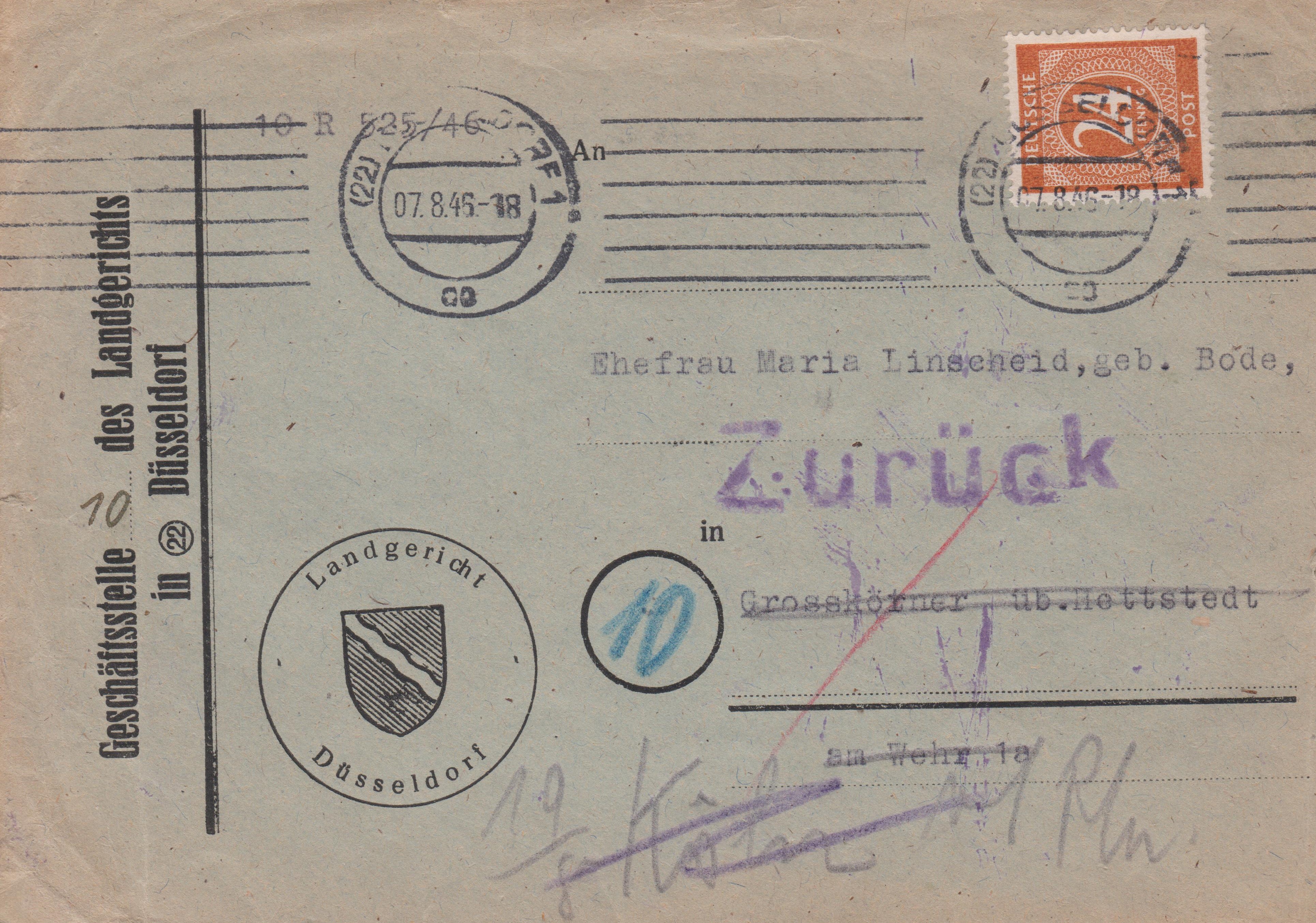 Einzelfrankatur MiNr. 925 am 07.08.1946 auf Brief vom Landgericht Düsseldorf, portogerecht im Fernverkehr von (22) DÜSSELDORF nach 10 Grosskötner über Hettstedt: