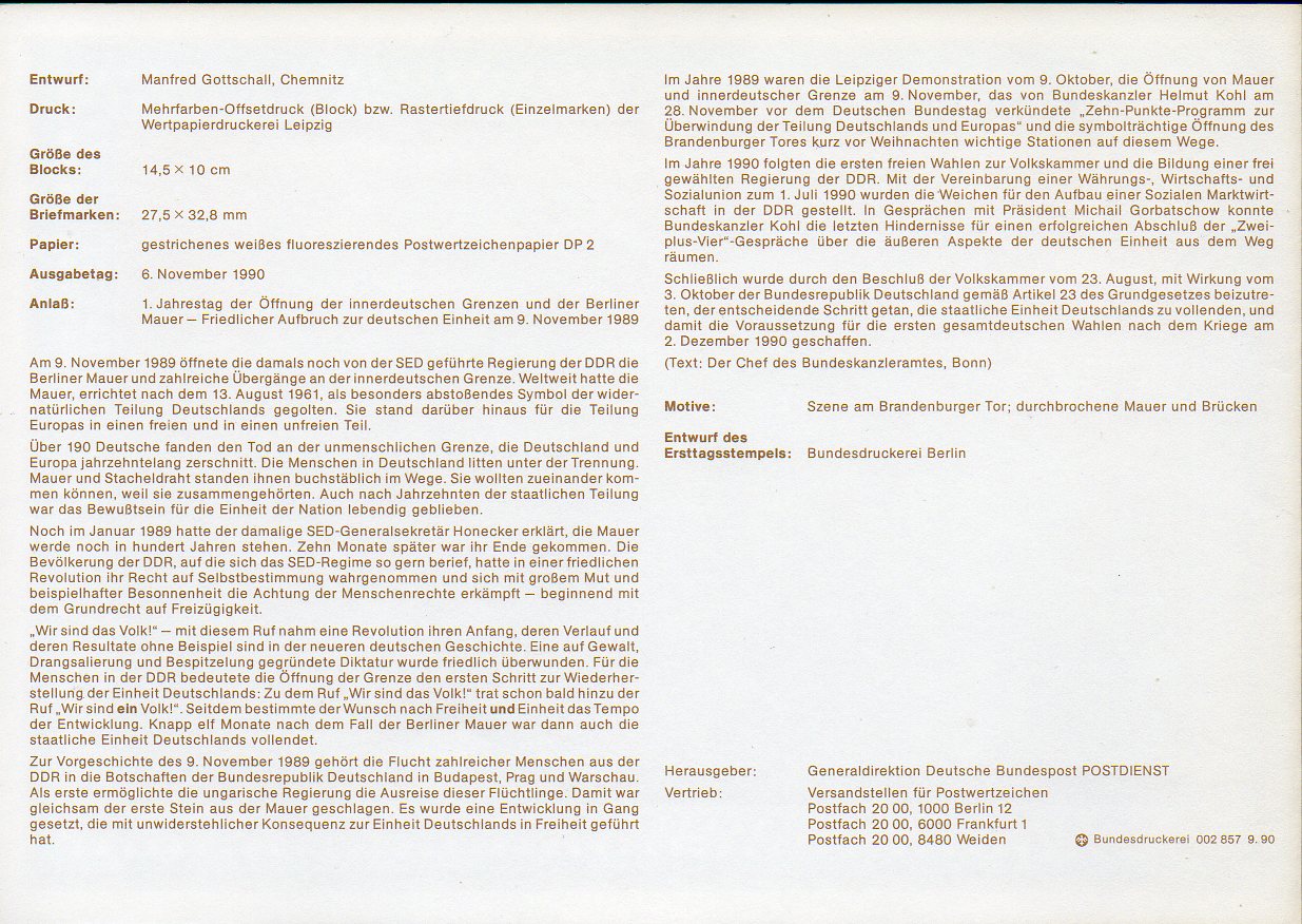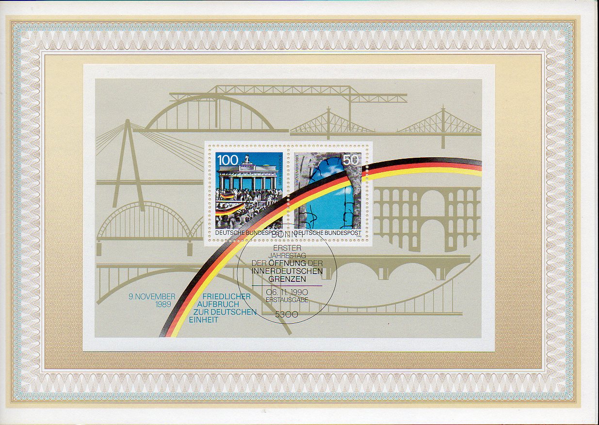 Als Beispiel zeige ich das Ersttagsblatt Zum 1. Jahrestag der Öffnung der innerdeutschen Grenzen und der Berliner Mauer.