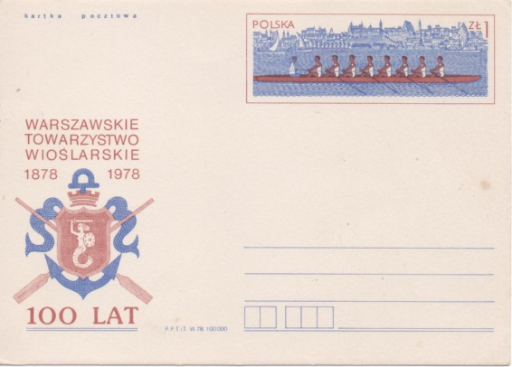 Die polnische Ganzsache zeigt im Wertstempel einen Achter. Deutlich zu erkennen ist der Steuermann, der als einziger in Fahrtrichtung guckt. Bei acht Ruderern sind nur vier Riemen zu erkennen, da die Riemen der anderen vier Ruderer auf der anderen Bootsseite und daher nicht im Bild sind.