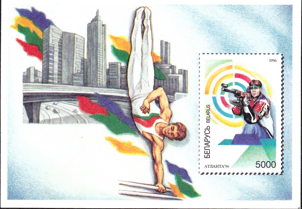 In Weißrussland gehörte auch noch ein Block (MiNr Block 9 mit MiNr 153) zur Ausgabe. Auf der Marke wird ein Schütze mit Luftgewehr gezeigt und auf dem Blockrand ein Turner am Barren. Im Hintergrund sehen wir die Silhouette von Atlanta.