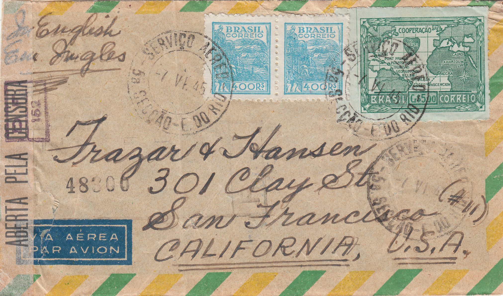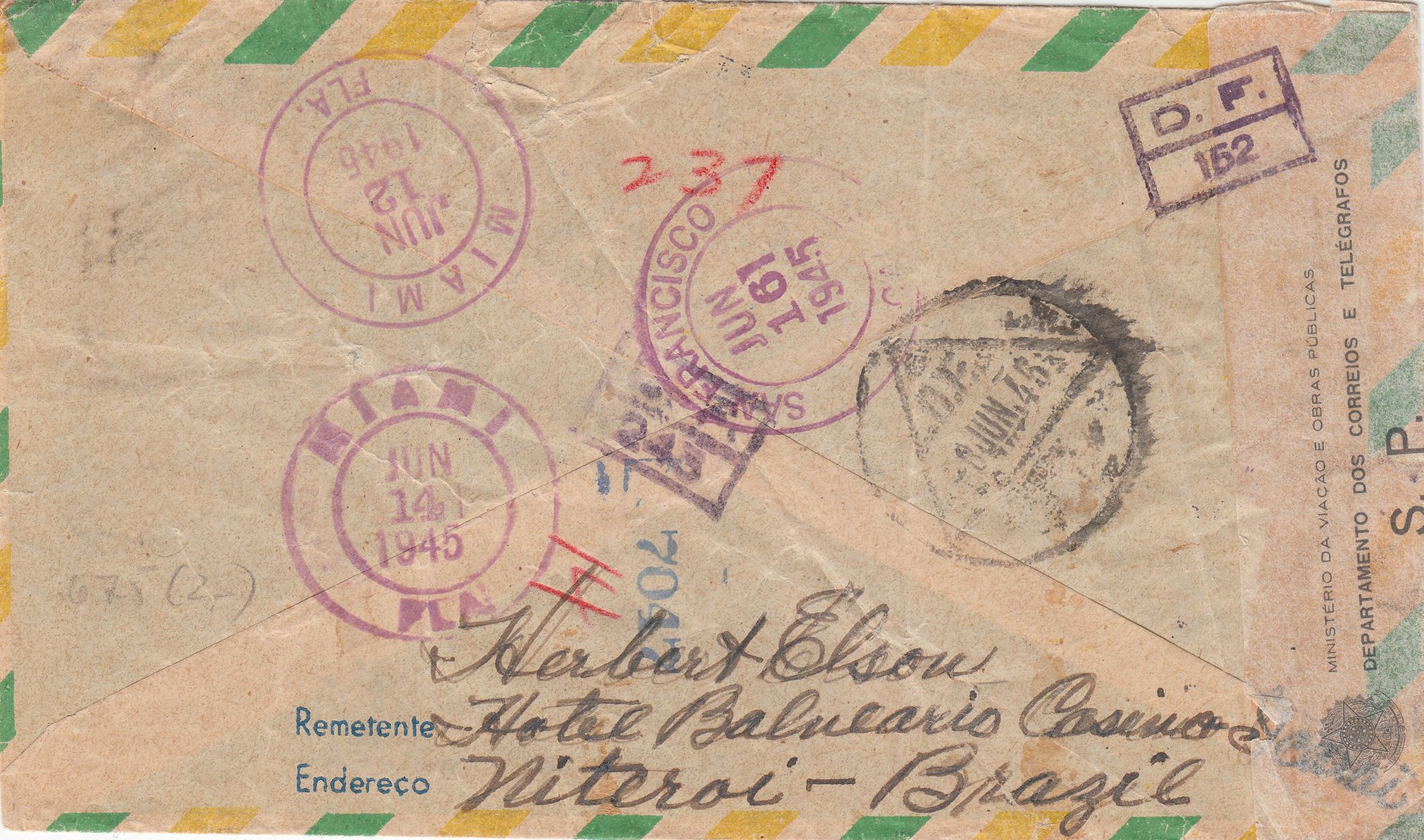 Dieser nach San Francisco in den USA adressierte Beleg wurde am 07.06.1945 in Brasilien aufgegeben:
