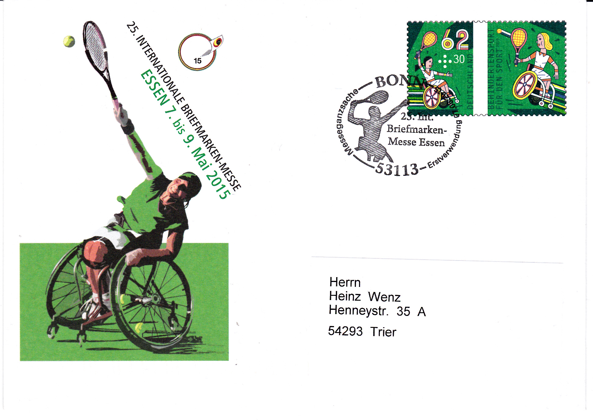 Zur Briefmarkenmesse 2015 in Essen erschien ein Sonderganzsachenumschlag mit dem Wertzeicheneindruck der 62+30 Cent-Marke der Sporthilfemarken 2015. Hier ein echt gelaufenes Exemplar mit dem Erstverwendungsstempel Bonn vom 7.5.2015 mit einer Rollstuhltennisspielerin im Stempelbild.