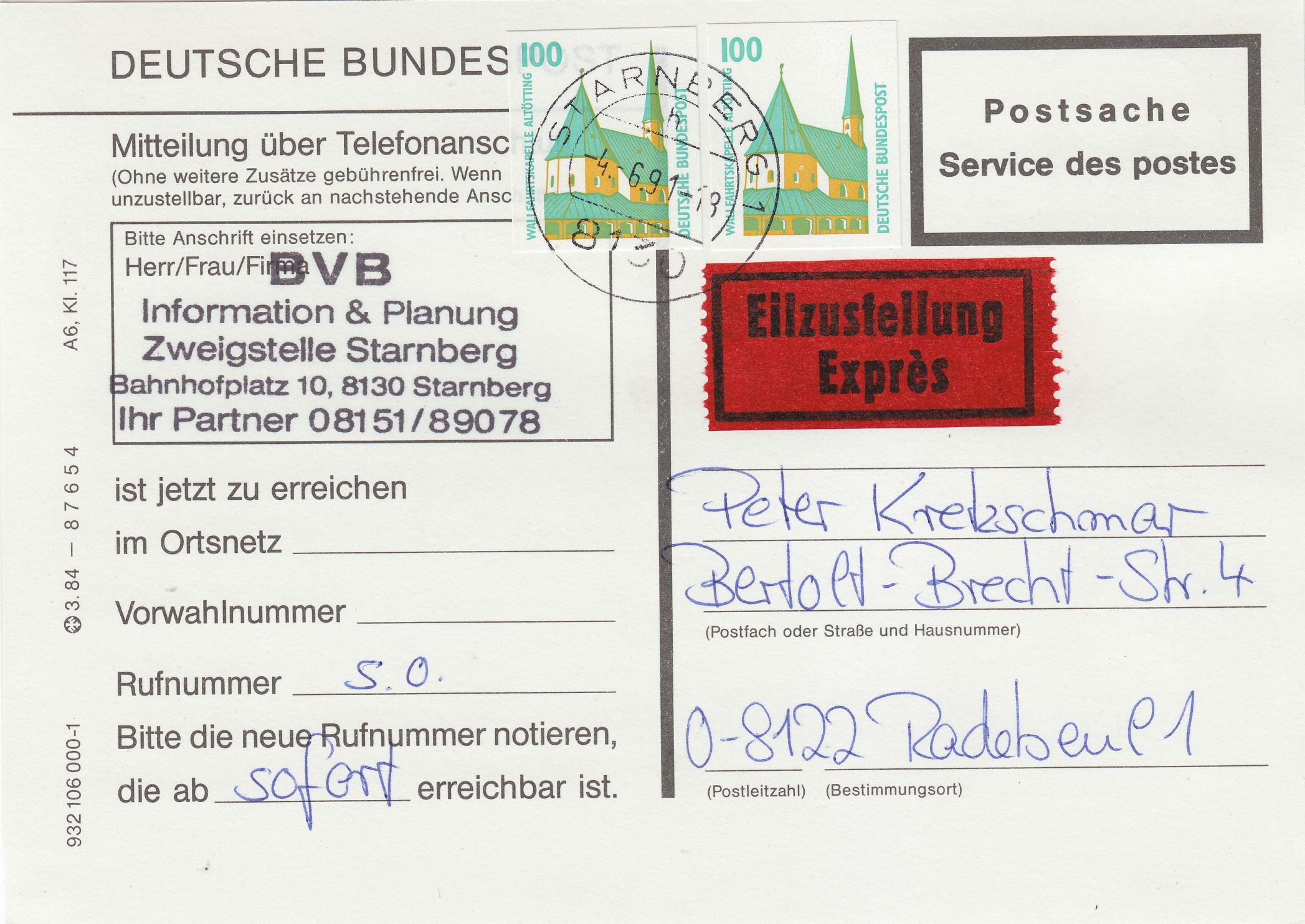 Portofreie Postsache, per portopflichtiger Eilzustellung vom VGW in das VGO zur bis zum 30.06.1991 geltenden ermäßigten Gebühr von 200 Pf, am 04.06.1991 als erstem Verwendungstag gelaufen ab Starnberg, frankiert als MeF 100 Pf (2).