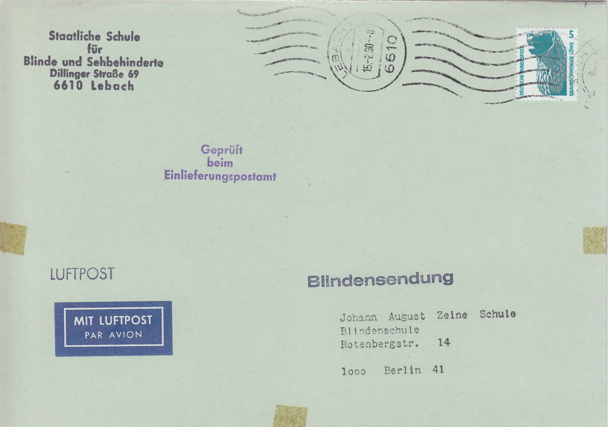 EF 5 Pf für Luftpostgebühr auf Blindensendung ab Lebach