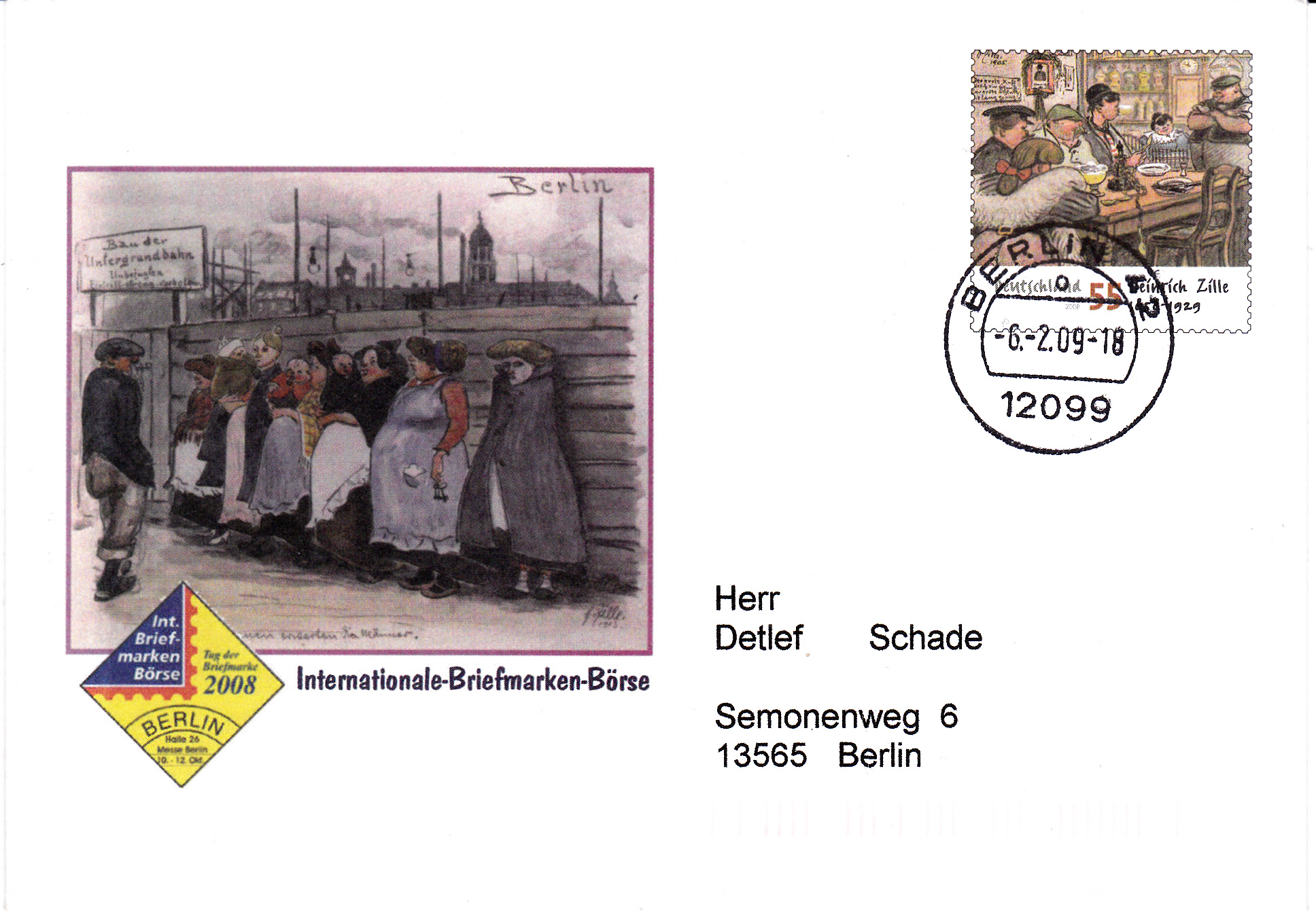 Zur Internationalen Briefmarken-Börse Berlin 2008 erschien am 9.10.2008 ein Sonderumschlag mit dem Wertstempel "150 Jahre Heinrich Zille" (Marke MiNr 2640) mit aufgedruckter Zähnung. Links auf dem Umschlag sind Zeichnungen von Heinrich Zille und ein Porträt von Zille abgebildet. Dieser Umschlag (MiNr USo 165) wurde am Ausgabetag verwendet.