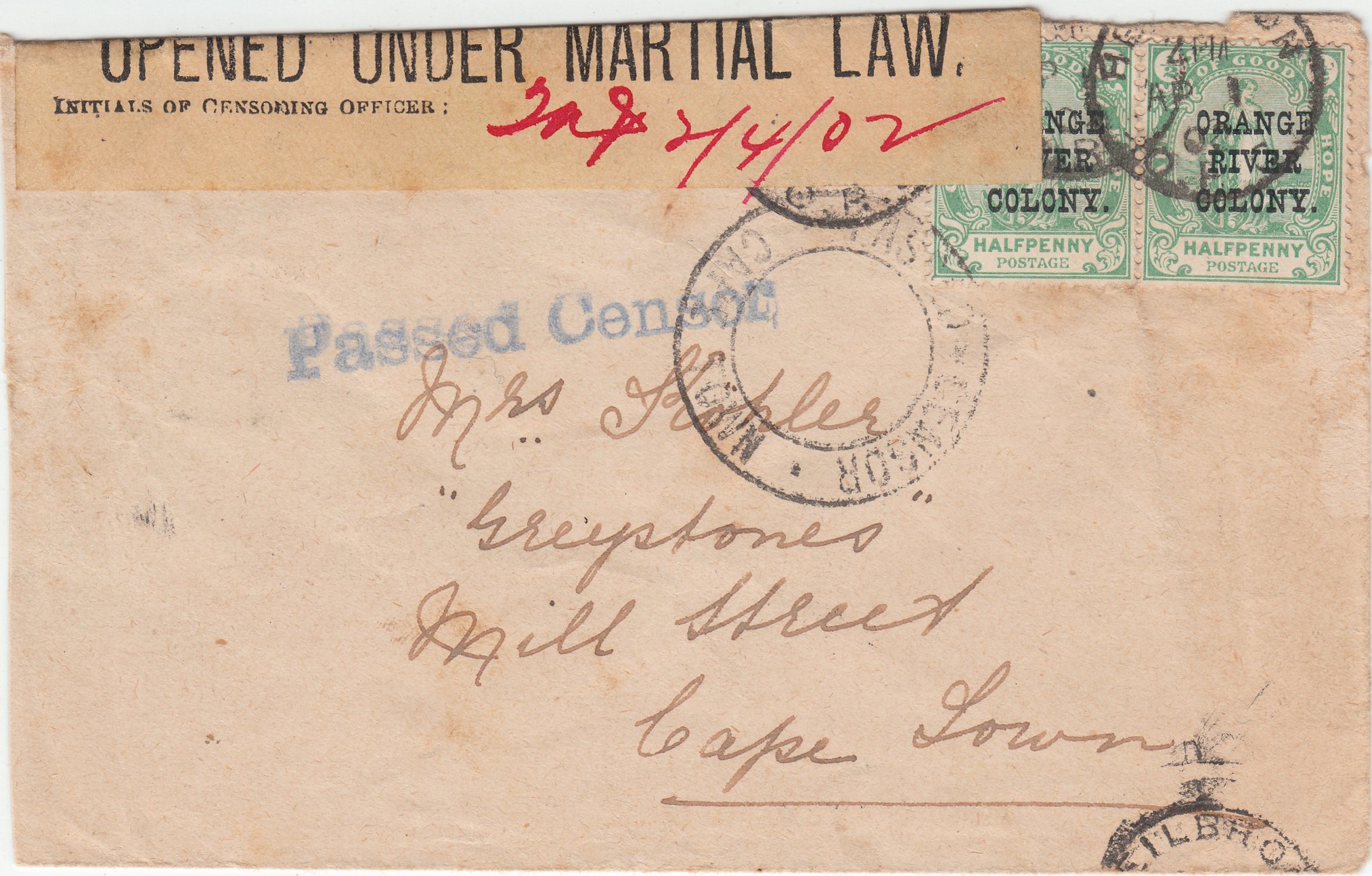 Dieser nach CAPE TOWN = Kapstadt adressierte Brief wurde am 01.04.1902 in HEILBRON in der ORANGE RIVER COLONY aufgegeben.