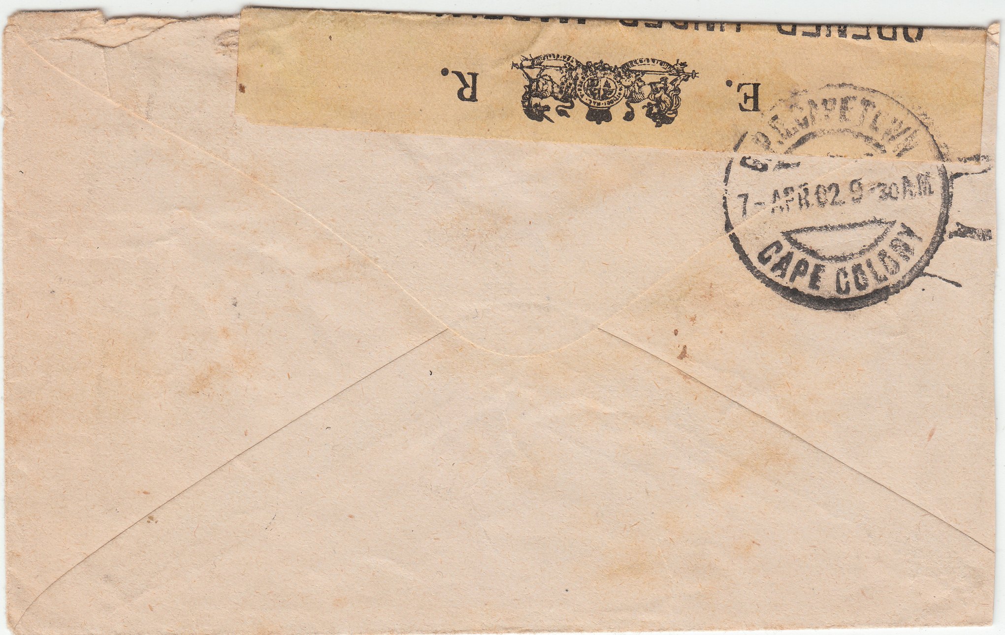 Rückseitig Tagesstempel "G.P.O CAPETOWN CAPE COLONY", also vom General Post Office = Hauptpostamt, vom 07.04.1902.