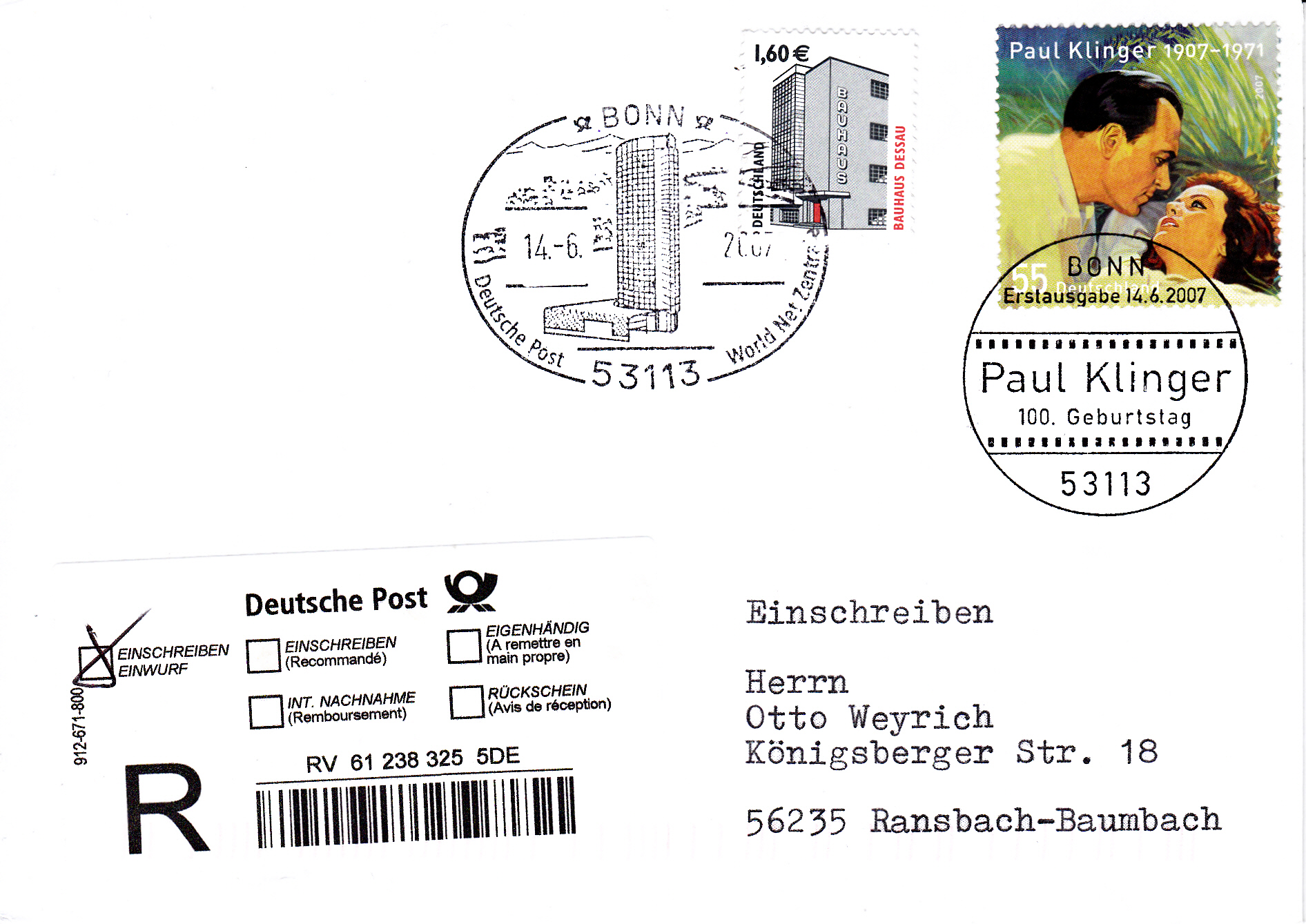 Brief als Einschreiben-Einwurf vom Ersttag der Marke zum 100. Geburtstag von Paul Klinger (MiNr 2611) mit dem Ersttagsonderstempel aus Bonn. Die Zusatzfrankatur für die Einschreibegebühr ist mit einem Handwerbestempel Bonn entwertet.