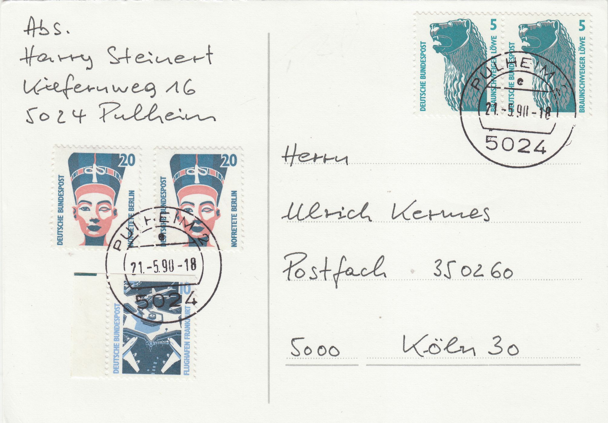 MiF 2x5 Pf mit 10 Pf und 2x20 Pf am 21.05.1990 portorichtig auf Postkarte (60 Pf)