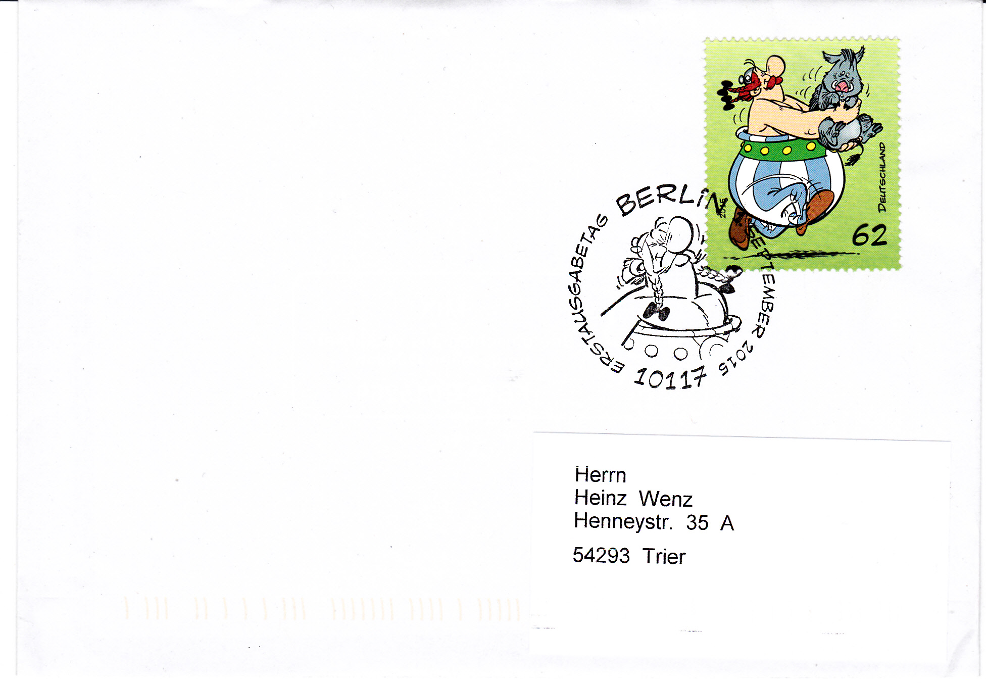 Für die selbstklebenden Marken aus dem sogenannten "Markenset" wurde ein eigener "Ersttagstempel" ein sogenannter "Erstverwendungsstempel" Bonn zur Abstempelung am 1.9.2015 benutzt. Hier sind Asterix und Obelix gemeinsam im Stempelbild. Hier ein Brief mit der Asterix-Marke.