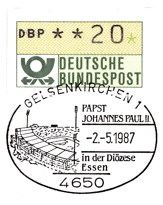 Der Sonderstempel aus Bottrop vom 2.5.1987 zum Besuch des Papstes Johannes Paul II in der Diözese Essen zeigt im Stempelbild das Parkstadion in Gelsenkirchen. Bei seinem Besuch in Gelsenkirchen zelebrierte Papst Johannes Paul II. am 2. Mai 1987 im Parkstadion vor 85.000 Menschen eine Heilige Messe. Er nahm auch die ihm angetragene Ehrenmitgliedschaft im FC Schalke 04 an.