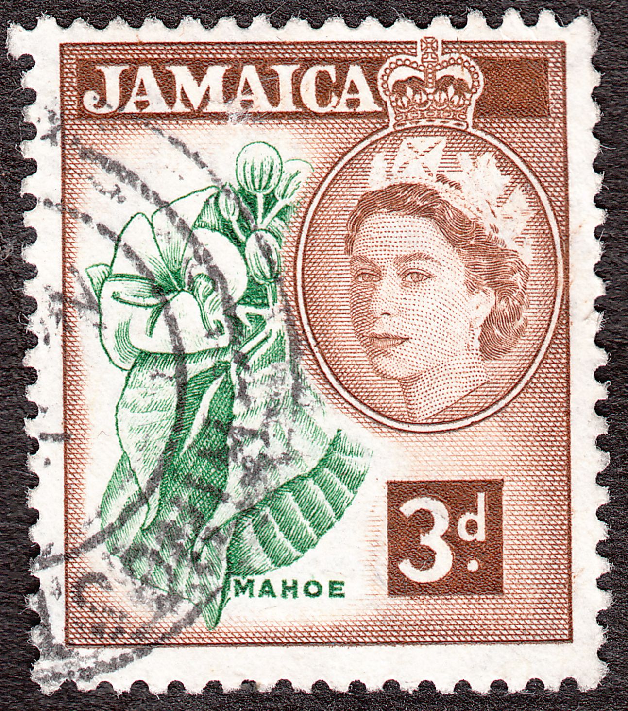 Diese Freimarke, Jamaika MiNr. 165, zeigt Königin Elisabeth II. sowie einen Hibiscus elatus, das ist eine Hibiskusart, die nur auf Jamaika und Kuba vorkommt: