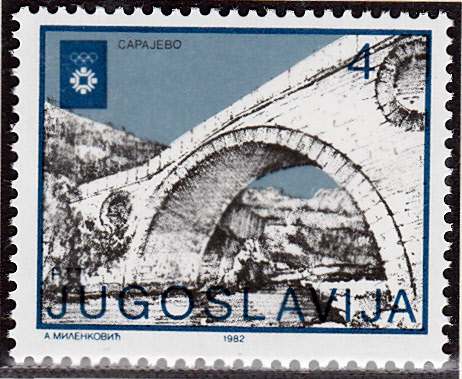 Die erste Markenausgabe zu den Olympischen Winterspielen 1984 erschien in Jugoslawien am 20. Nov 1982 mit Motiven "Ansichten von Sarajevo". Auf der Marke zu 4 Din (MiNr 1980) wird die Brücke über die Miljacka gezeigt.