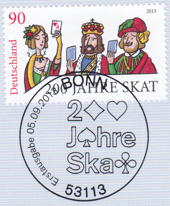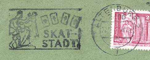 Eine historische Spielkarte wird in einem Maschinenstempel Bielefelds abgebildet. Der Beitext macht Reklame für das Spielkarten-Museum in Bielefeld.