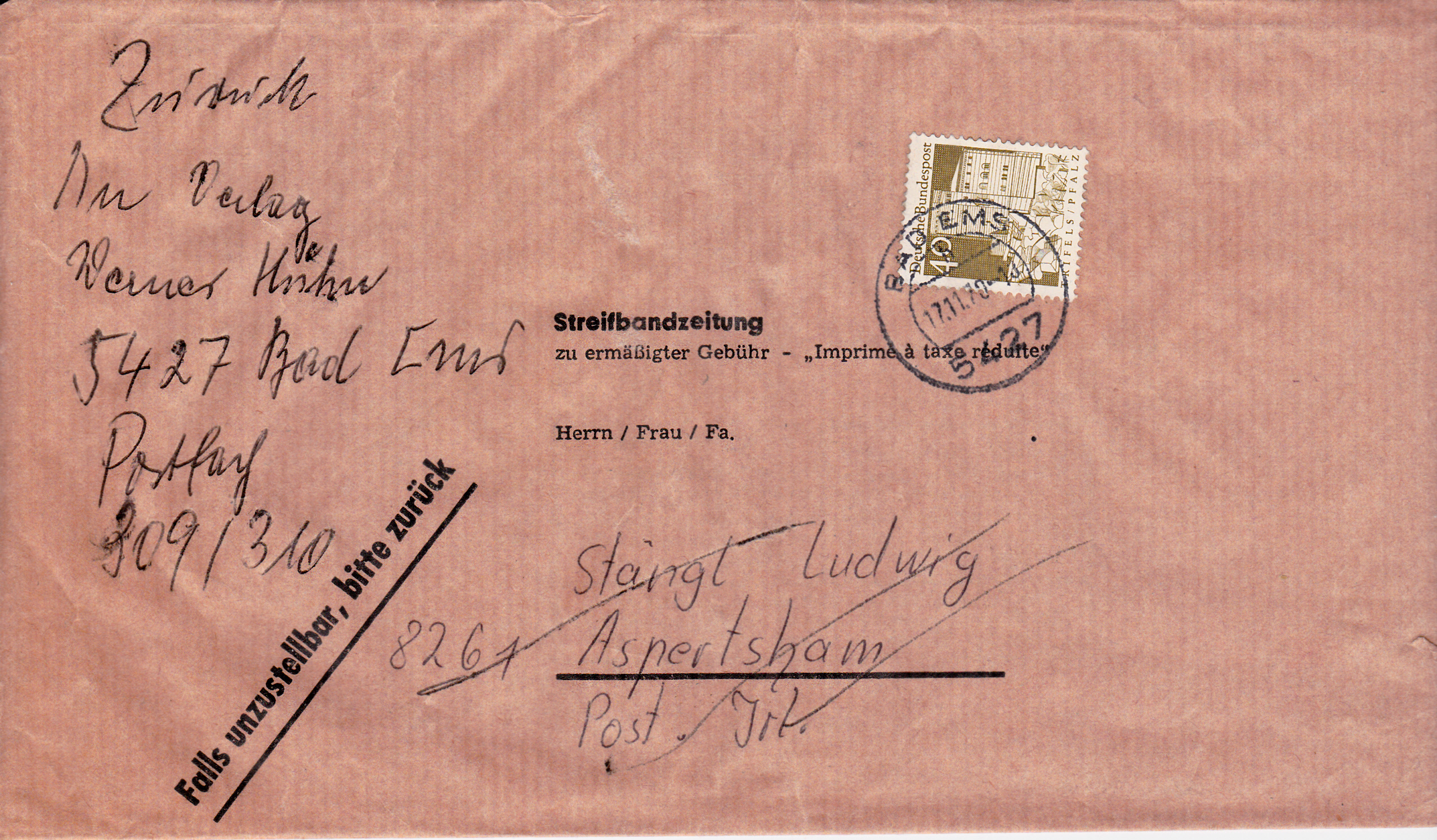 40 Pfennigwert "Trifels" (MiNr 494) aus der Serie Deutsche Bauwerke großes Format als Frankatur für eine Streifbandzeitung.