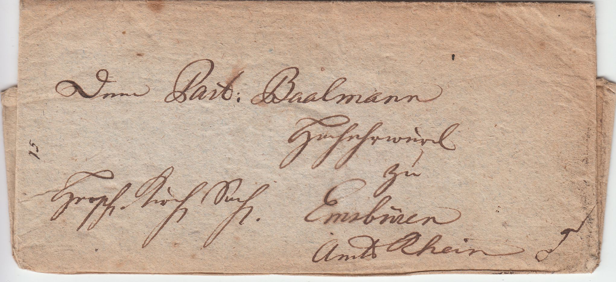Der Beleg wurde adressiert "Dem Past. Baalmann Hochehrwürden zu Emsbüren Amt Rheine" (Past. = Pastor) und als Sendungsart wurde "Großh. Kirch Sache" = Großherzogliche Kirchensache angegeben.