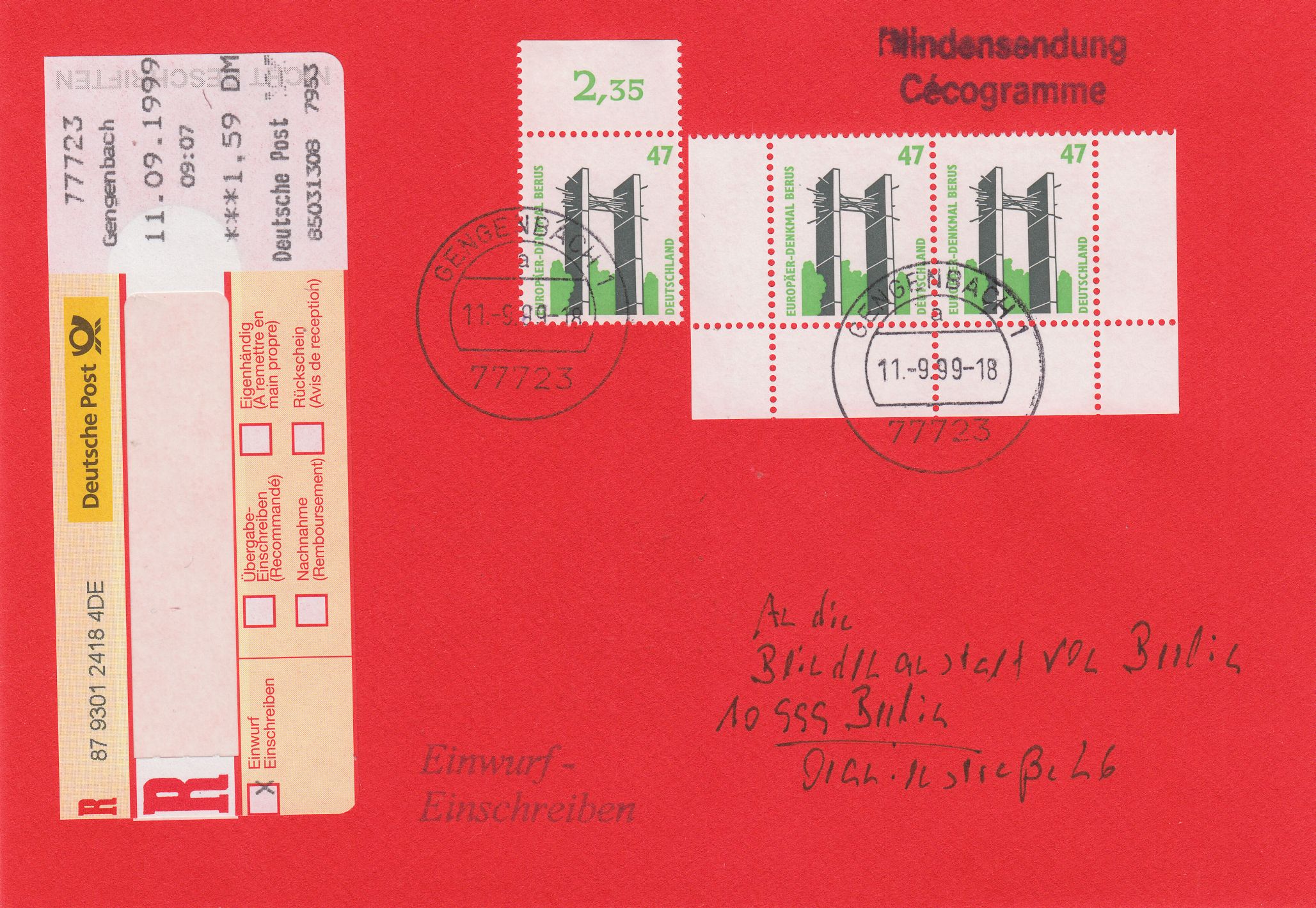 Blindensendungen wurden portofrei befördert, für Zusatzleistungen mußte das entsprechende Porto entrichtet werden. Dieser Beleg wurde frankiert mit 3 Exemplaren der Wertstufe 47 Pf sowie einer auf dem Einschreiblabel vermerkten Teilbarfrankatur in Höhe von 1,59 DM am 11.09.1999 portorichtig für die Zusatzleistung "Einwurf-Einschreiben":