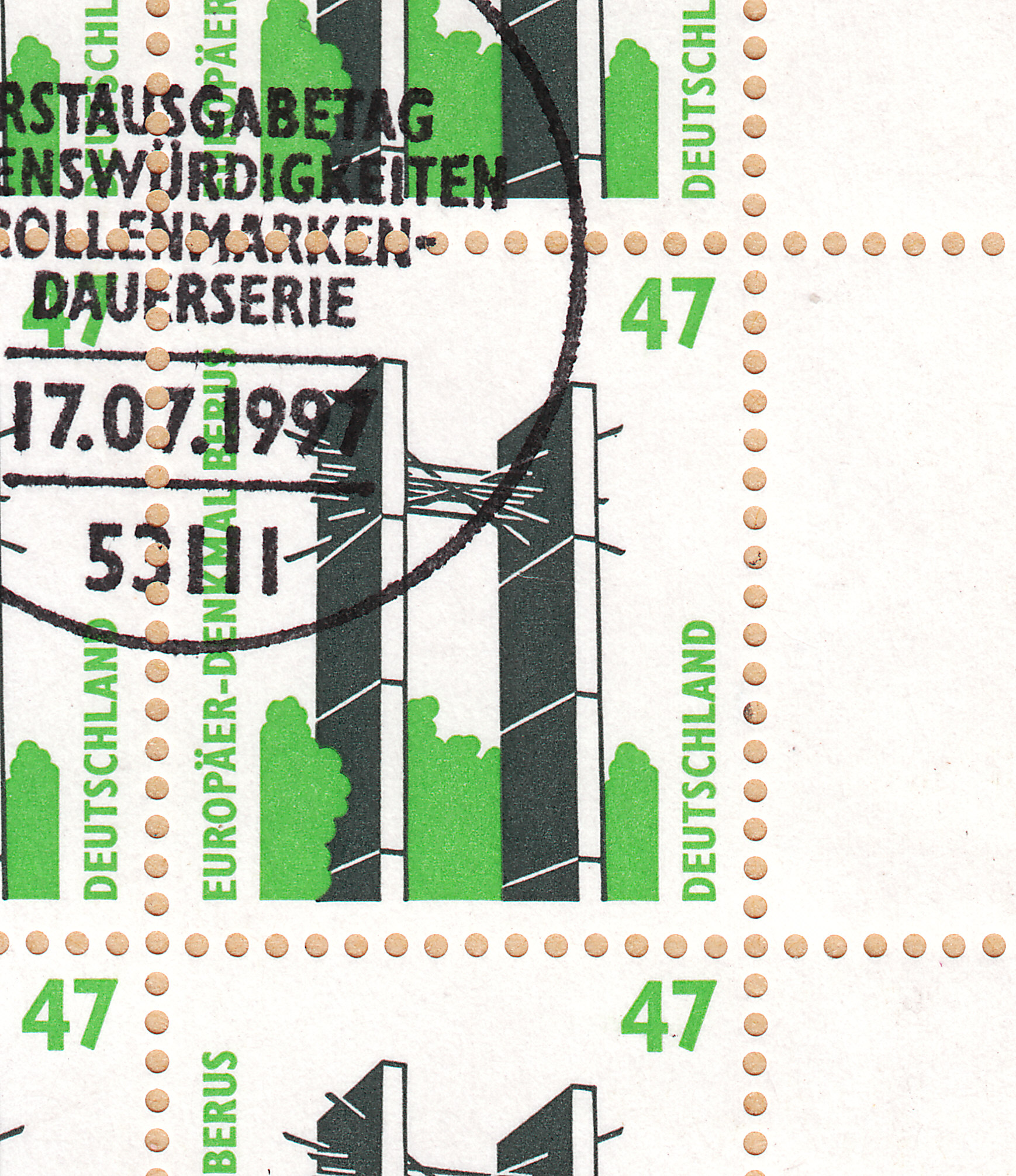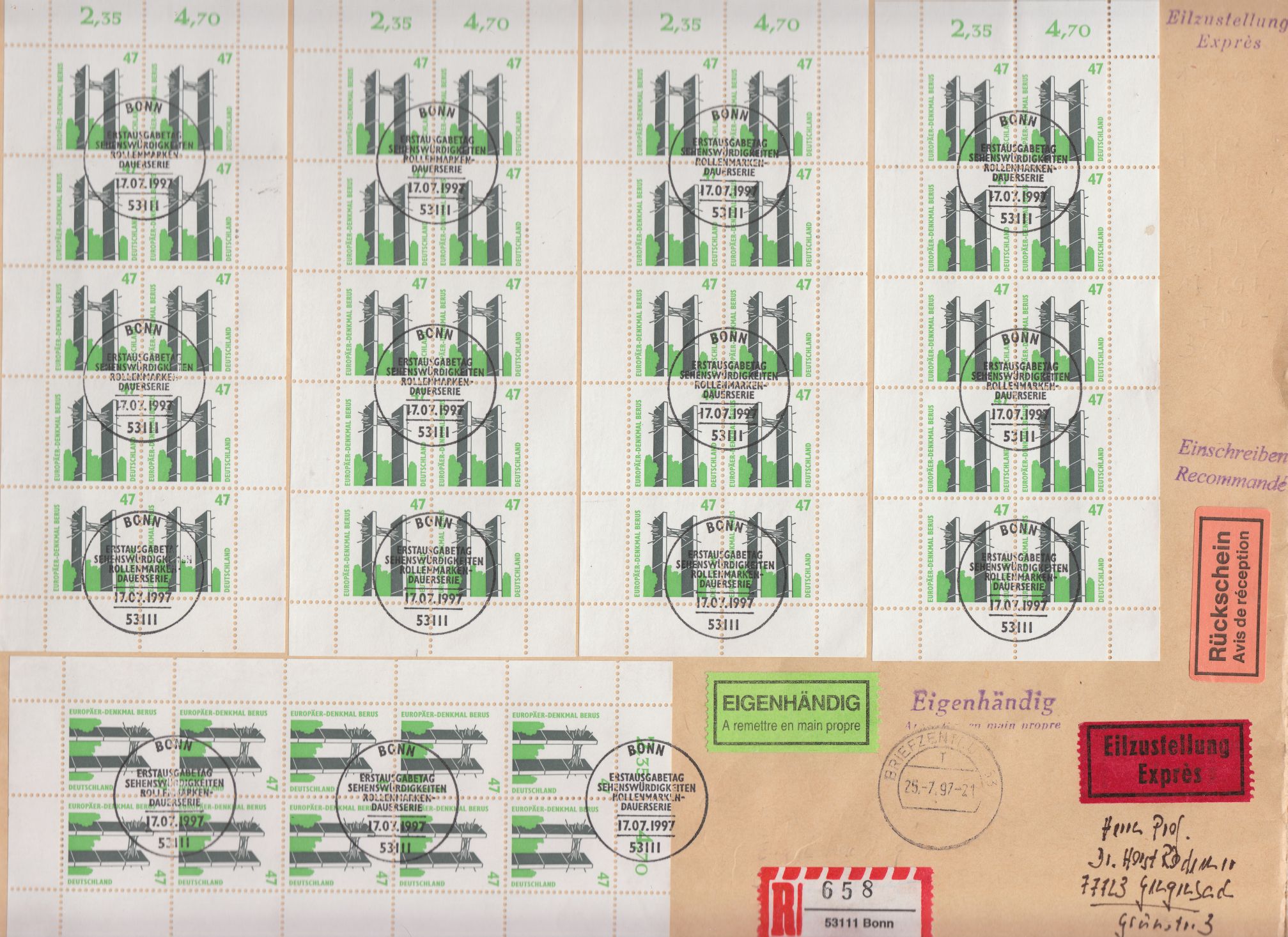 Hier kommt das Pendant zu dem eben gezeigten Beleg, dieser hier trägt den ESST BONN, wurde jedoch nicht am Erstausgabetag abgeschickt, sondern innerhalb der 30tägigen Nachstempelfrist für diesen ESST. Daher wurde am 25.07.1997 um 21 Uhr ein Tagesstempel im BRIEFZENTRUM 53 abgeschlagen, um die Laufzeit dieses Eilbriefes zu dokumentieren: