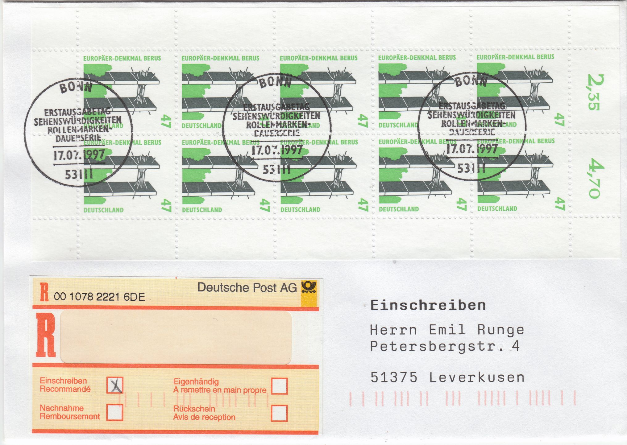 Standardbrief (100 Pf) per Einschreiben (350 Pf) ergibt die Portostufe 450 Pfennig. Dieser Beleg, frankiert mit eiem Zehnerbogen, entwertet per ESST, ist somit um 20 Pfennig überfrankiert: