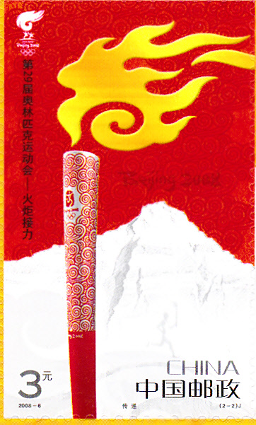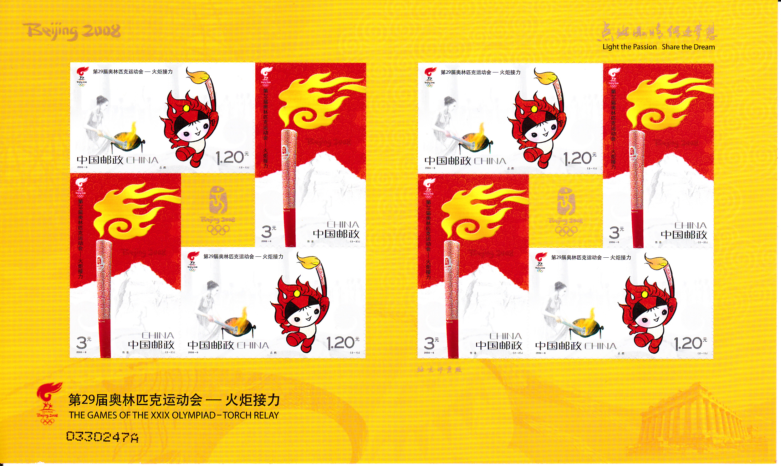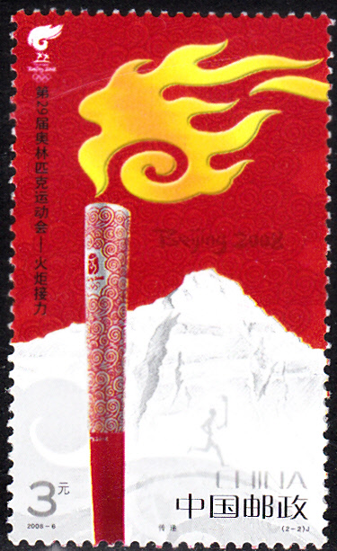 Zum Olympischen Fackellauf 2008 erschien in der Volksrepublik China diese Marke (MiNr 3949) mit der Abbildung des Maskottchen Huanhuan mit Fackel und der Entfachung des Olympischen Feuers mittels Hohlspiegel in Olympia, Griechenland. Bei den Marken aus der Volksrepublik China befinden sich am Unterrand bei den Marken jeweils das Ausgabejahr, die Nummer der Ausgabe, die Anzahl der Marken der Ausgabe und die Nummer der Marke: bei dieser Marke sind die Zahlen links 2008 - 6 und rechts (2 - 1). Dies bedeutet, dass die Marke in der sechsten Ausgabe des Jahres 2008 erschienen ist, die Ausgabe hat insgesamt 2 Marken und diese Marke ist die 1. Marke der Ausgabe.