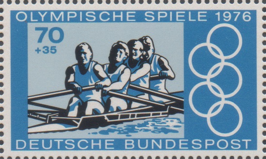 Auch die MiNr. 2505, der 50 Pfennig-Wert der DDR-Ausgabe zu den Olympischen Sommerspielen 1980 in Moskau, von vielen Sportnationen boykottiert, zeigt einen Vierer ohne.