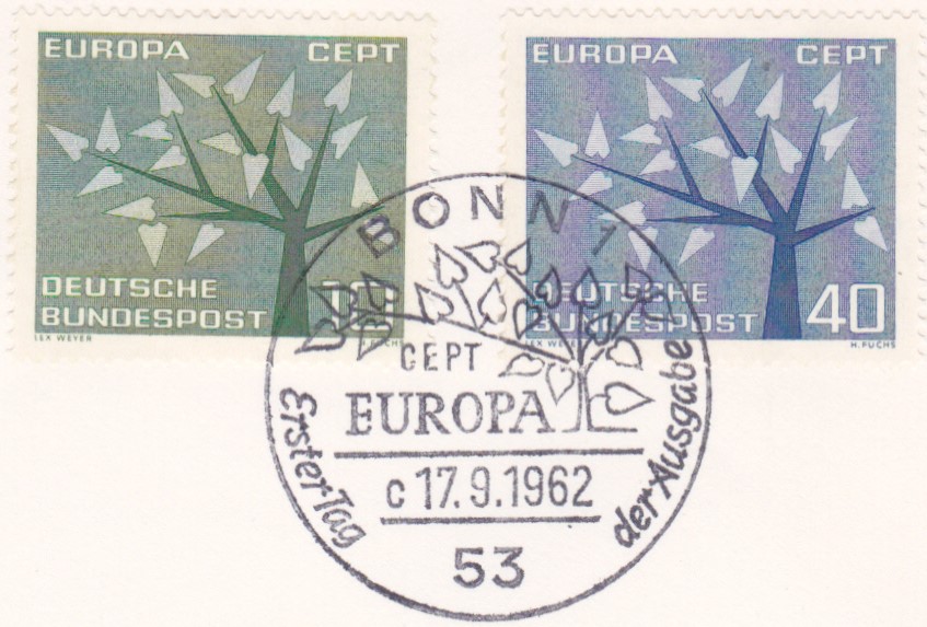 Am 17.09.1962 erschien in einer Auflage von 85 Millionen Stück diese Europamarke der Wertstufe 10 Pfennig, katalogisiert als MiNr. 383: