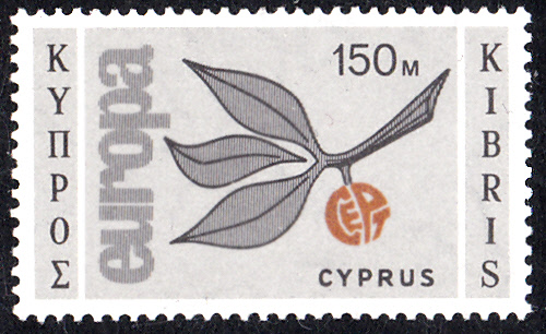 In Zypern erschienen die Europamarken 1965 am 27. September 1965. Hier die Marke zu 150 Mills mit dem Gemeinschaftsmotiv "Zweig mit drei Blätter und aus den Buchstaben „CEPT“ gebildeter Frucht", die in einer Auflage von 416 694 Stück erschien.