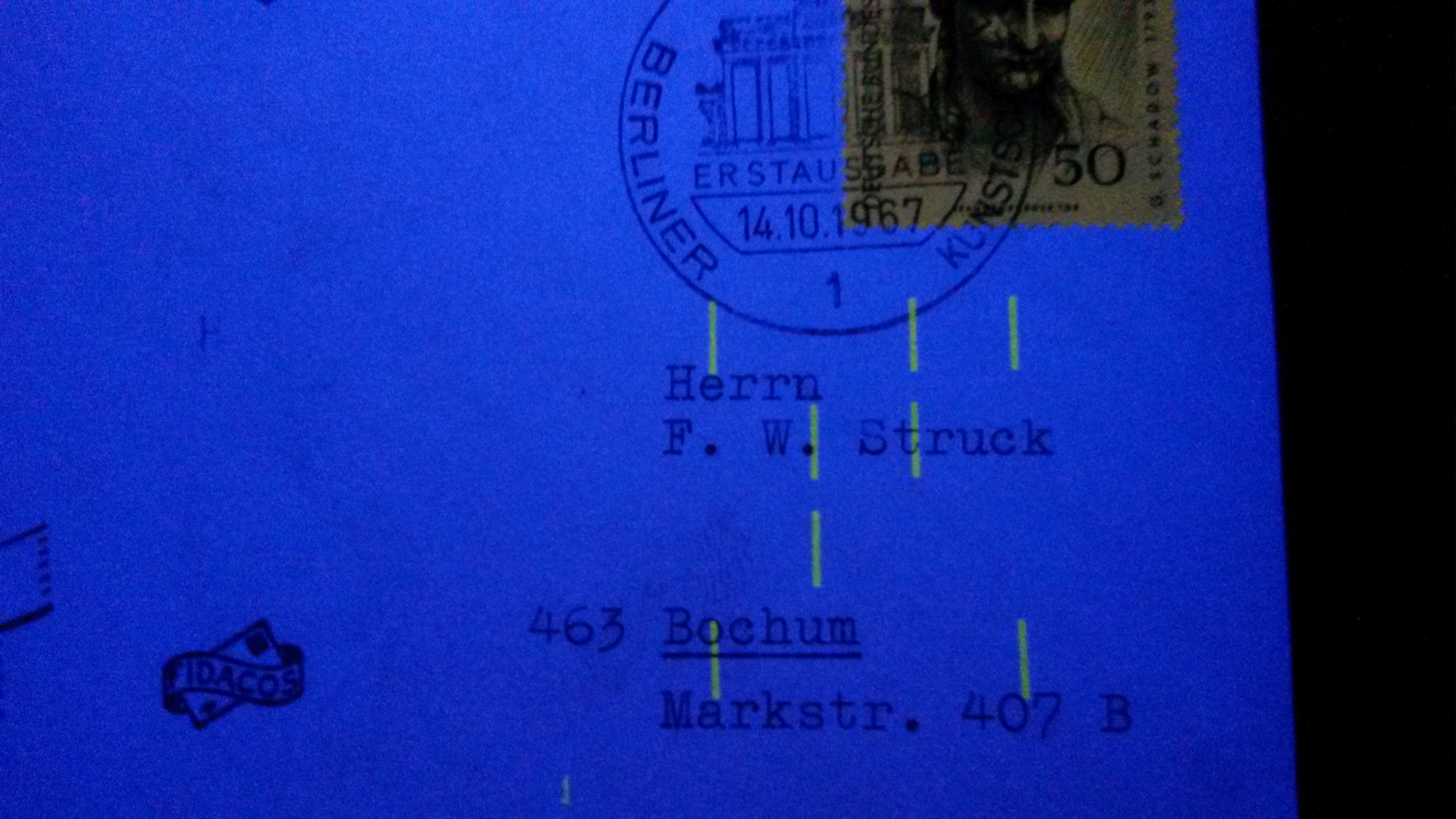 Dieser nach Bochum adressierte FDC aus Berlin durchlief in Bochum zur Eingangscodierung die automatische Briefsortieranlage, wo am Codierplatz "H" eine Linearcodierung "4314" für die "Markstraße" angebracht wurde: