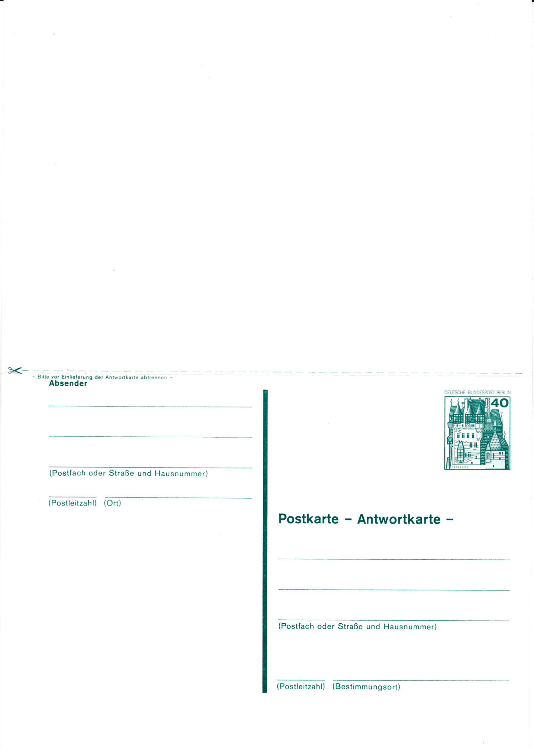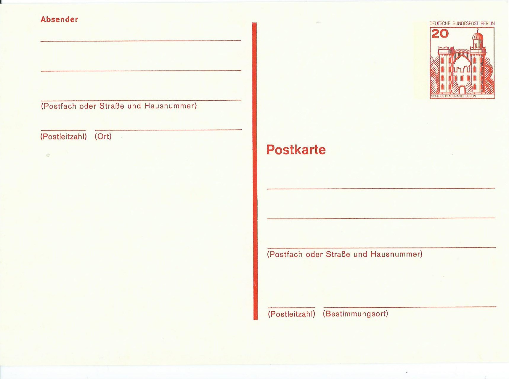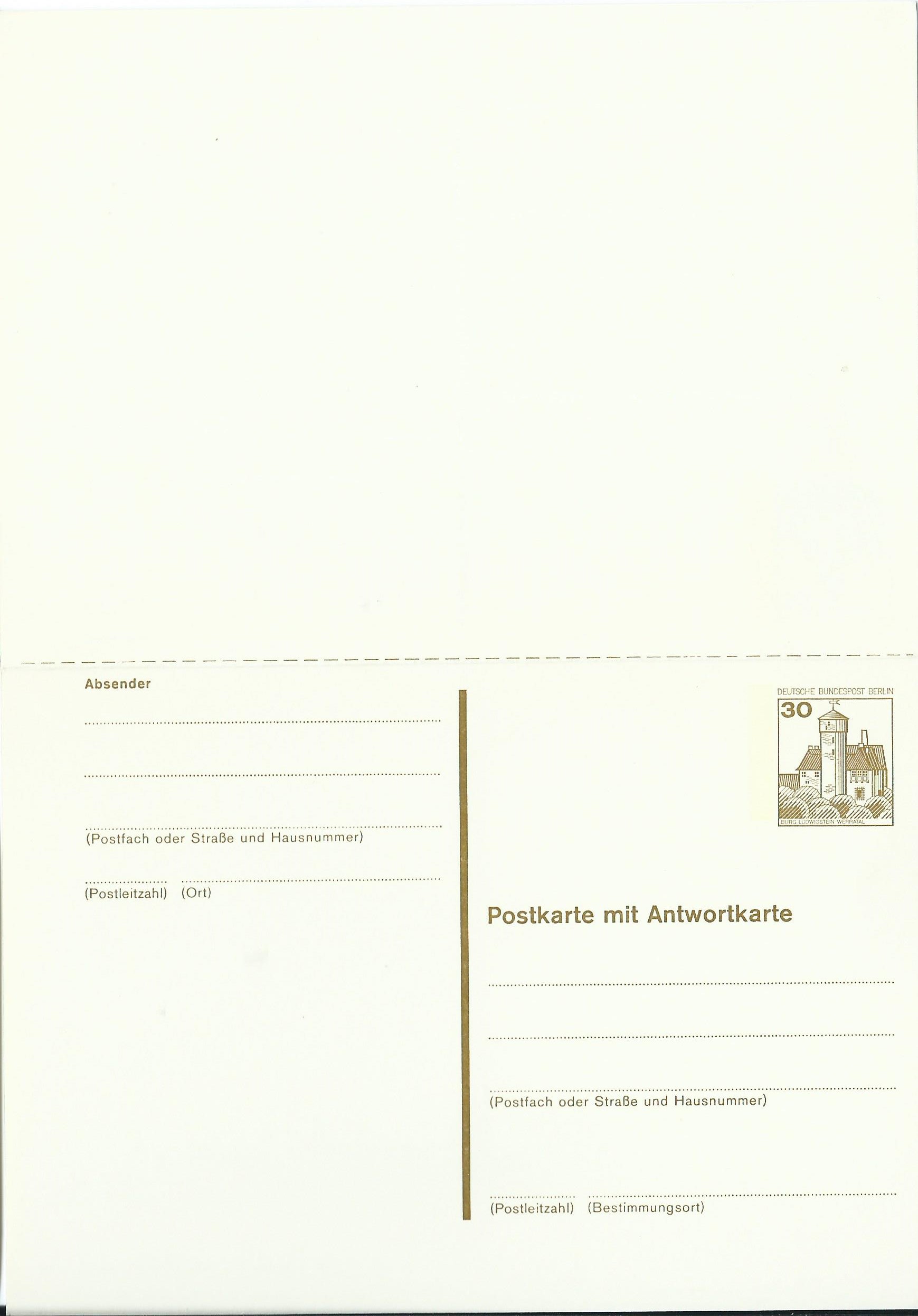 Den Anfang macht eine Postkarte zu 20 Pf (MiNr P 103) mit dem entsprechenden Markenmotiv der Rollenmarkenserie. Sie war für den Innerortspostverkehr von Berlin vorgesehen.