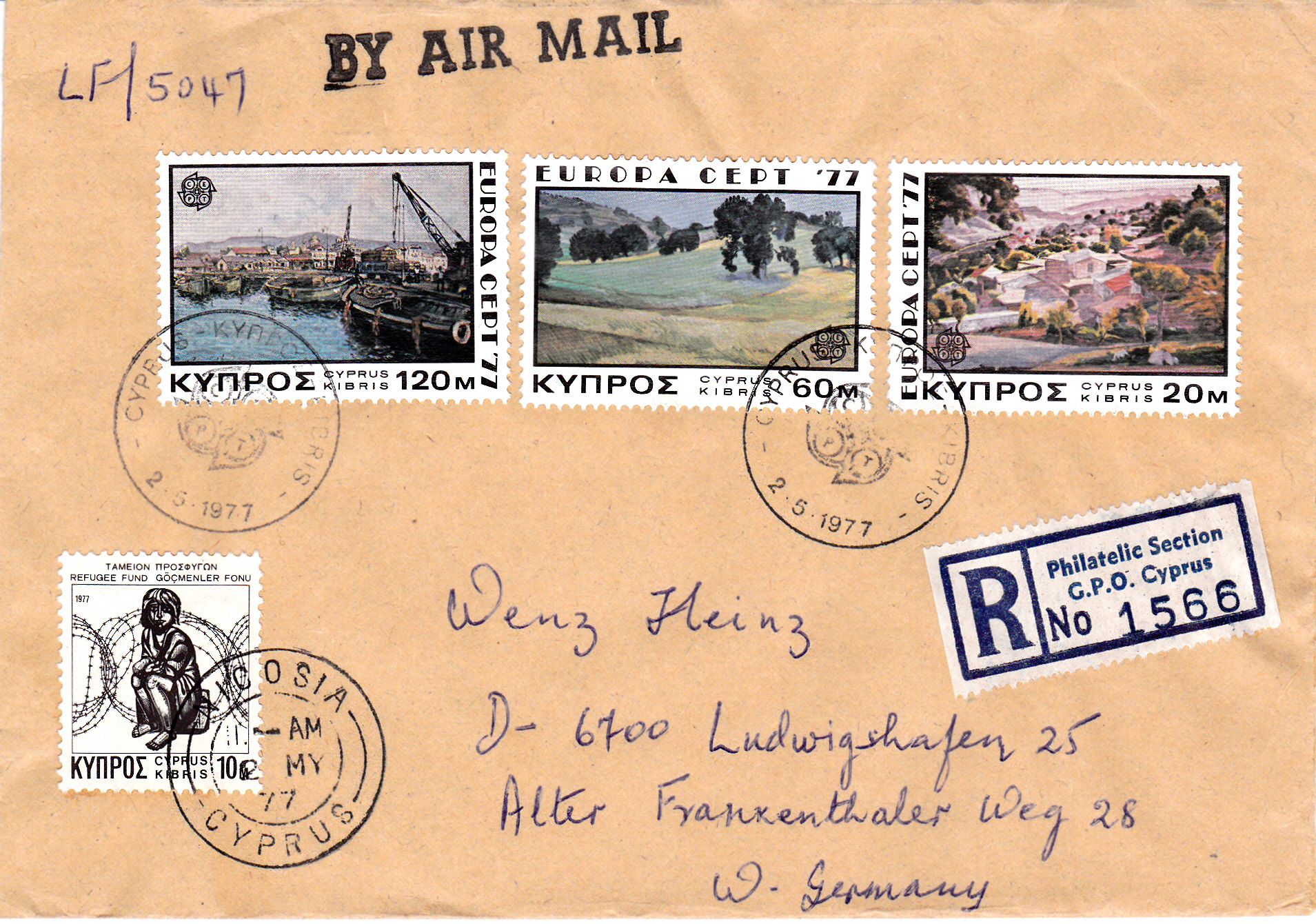 Kompletter Satz der Europamarken 1977 mit der Zwangszuschlagsmarke für die Flüchtlingshilfe auf einem Einschreibebrief mit Luftpost vom 2.5.1975 von Nicosia nach Ludwigshafen. Die Europamarken wurden mit dem Ersttaghsonderstempel entwertet, die Zwangszuschlagsmarke mit einem Tagesstempel.