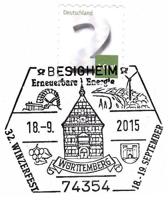 Sonderstempel aus Besigheim von 18.9.2015 zum 32.Winzerfest am 18./19.September 2015. Im Stempelbild sind links unten auch Weintrauben und Rebenblätter zu sehen.