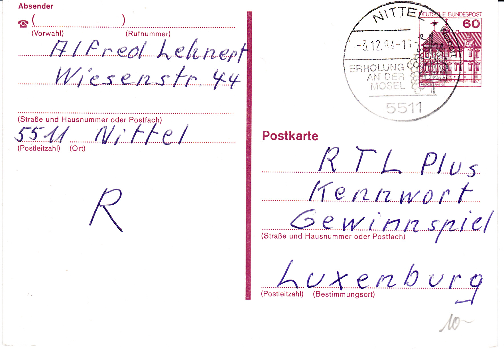 Handwerbestempel aus Nittel vom 3.12.1984 mit einer Abbildung von Weintrauben.