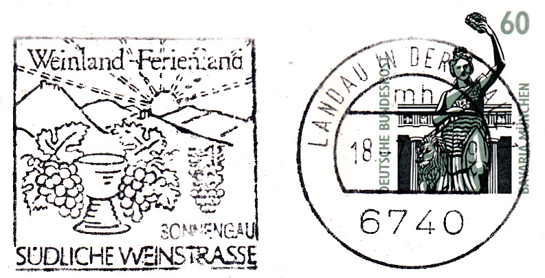 Maschinenwerbestempel aus Landau in der Pfalz mit dem Werbeeinsatz "Weinland - Ferienland Südliche Weinstrasse" und Weintrauben und Weinrömer im Bild.