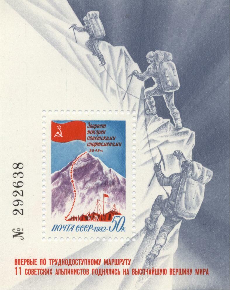 Der Mount Everest wird auf diesem Markenblock gewürdigt. Aber was ist wohl unter dem