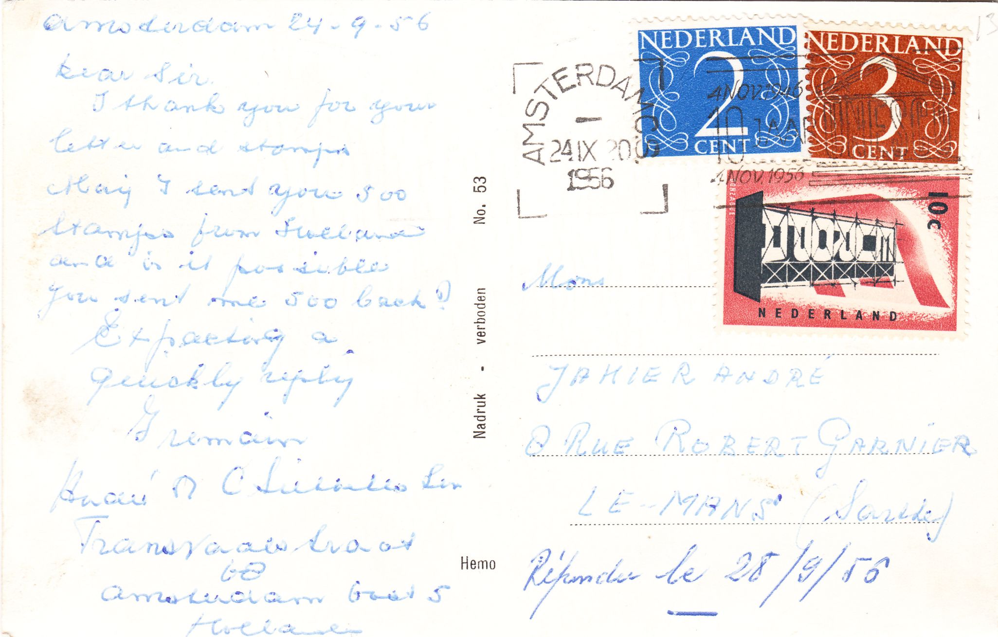 MiF am 24.09.1956 auf Postkarte, gelaufen von Amsterdam nach Le Mans: