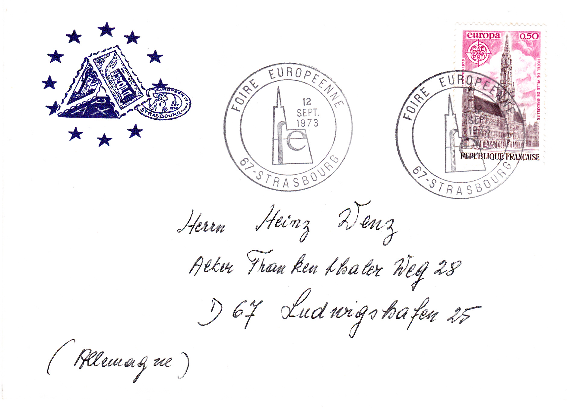 Der am 14. April 1973 erschienene 0,50 Franc-Wert der Europamarkenausgabe 1973 mit dem Motiv "Rathaus, Großer Platz von Brüssel" (Auflage 20 000 000 Stück) wurde hier als EF auf einem Brief von Straßburg nach Ludwigshafen verwendet. Die Marke wurde mit einem Sonderstempel zur "Foire Europeene" gestempelt. Die "Europäische Messe" ist eine Veranstaltung, die jährlich im September in Straßburg in Frankreich stattfindet und den Besuchern eine Vielzahl von Konsumgütern anbietet.