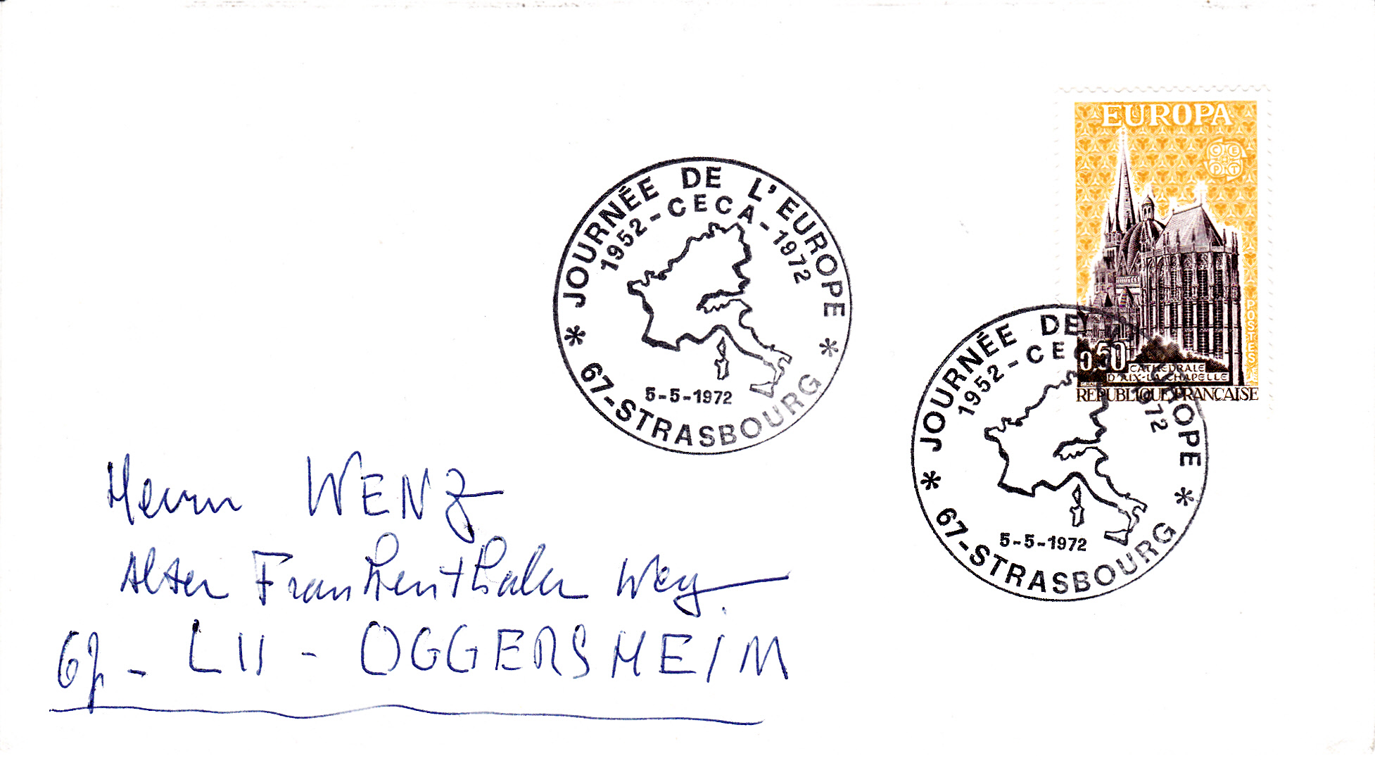 In Frankreich erschienen die Europamarken 1972 am 22. April 1972. Hier die Marke zu 0,50 Fr mit dem Motiv "Dom zu Aachen, Deutschland" als Einzelfrankatur auf einem Brief von Straßburg nach Ludwigshafen. Die Abstempelung erfolgte mit einem Sonderstempel vom 5.5.1972 zum Europatag. Die Auflage der Marke betrug 21 550 000 Stück.