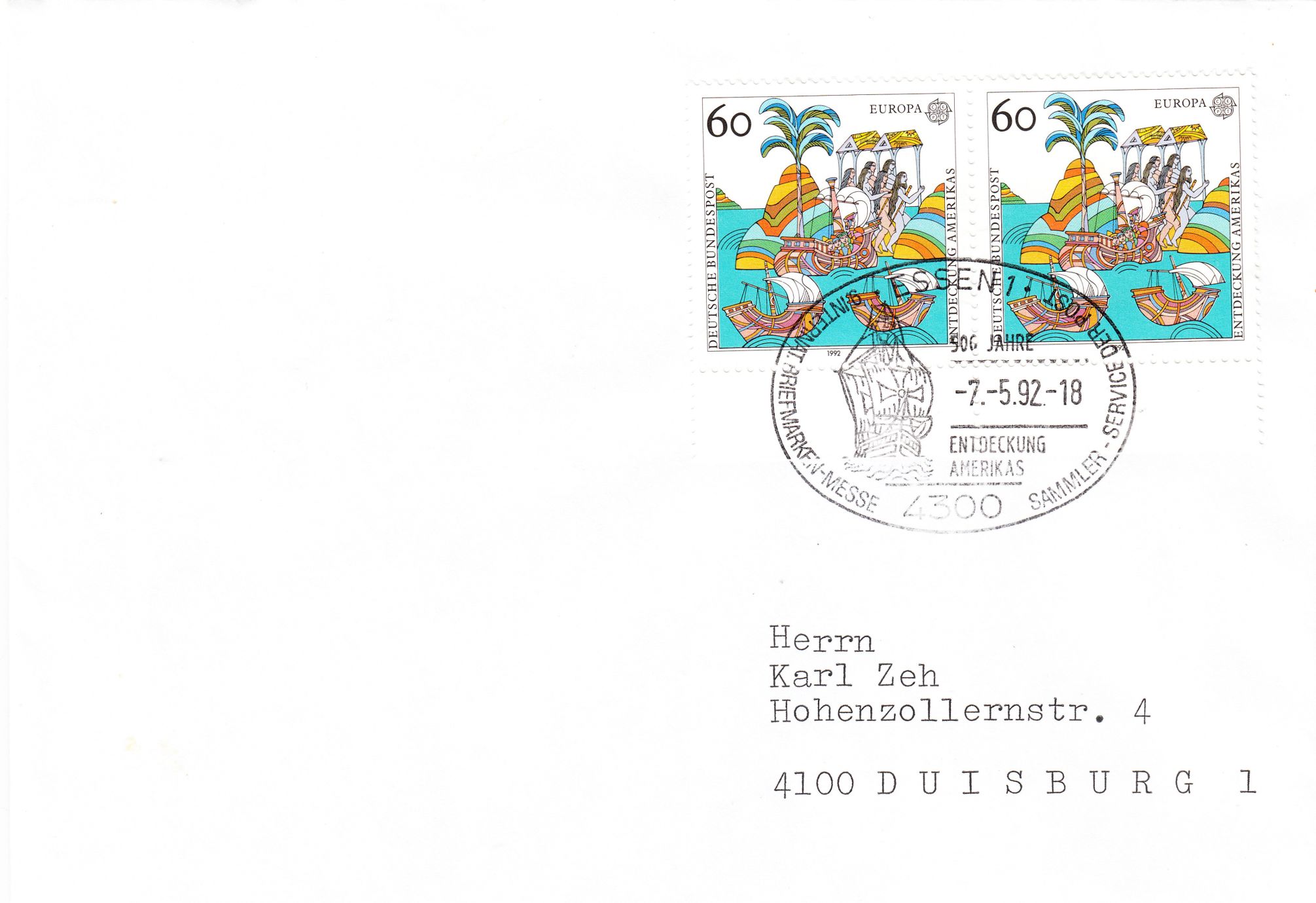 Zur 9. Internationalen Briefmarken-Messe Essen erschien eine Ganzsachenpostkarte mit dem Wertzeicheneindruck der 60Pf Europamarke 1992 (MiNr PSo 27). Hier ein ungebrauchtes Exemplar.
