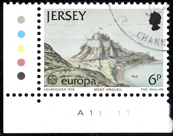 Auf Jersey erschienen die Europamarken 1978 am 1. Mai 1978 zum Gemeinschaftsthema "Baudenkmäler". Hier ein Eckrandstück mit Plattennummer und Farbpunkten in den Druckfarben der Marke zu 6 Pence. Die Marke zeigt das Schloss Mont Orgueil. Die Marke erschien in einer Auflage von 2 602 412 Stück.