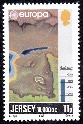 Auf Jersey erschienen die Europamarken 1982 zum Gemeinschaftsthema "Historische Ereignisse" am 20. April 1980 mit Darstellungen zum Thema "Erdgeschichtliche Entwicklung der Insel Jersey zwischen 16 000 bis 4000 v. Chr.". Hier eine der Marken zu 11 Pence mit der Darstellung aus dem Jahre 10 000 v.Chr.