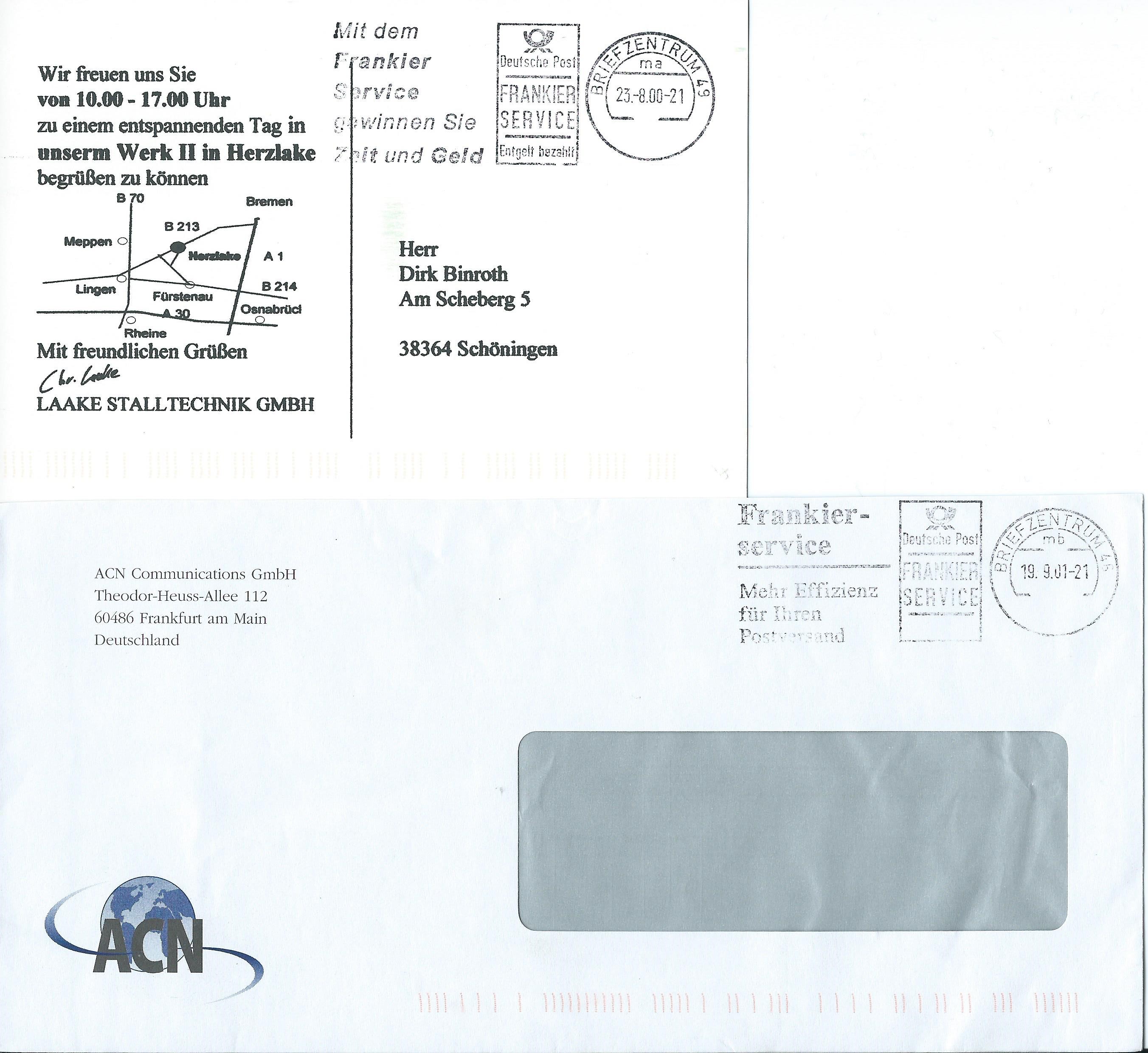 der zuletzt gezeigte Beleg wurde offenbar nicht in einem Briefzentrum vom Frankierservice gestempelt, sondern nach meiner Meinung vom Absender wurde Infopost mit einem sogenannten Absenderentwerter gestempelt. Die Form des Stempels ist allerdings auch neueren Datums, da die älteren Absenderentwerter auch einen runden Stempelkopf hatten und das Wort Infopost senkrecht stand.