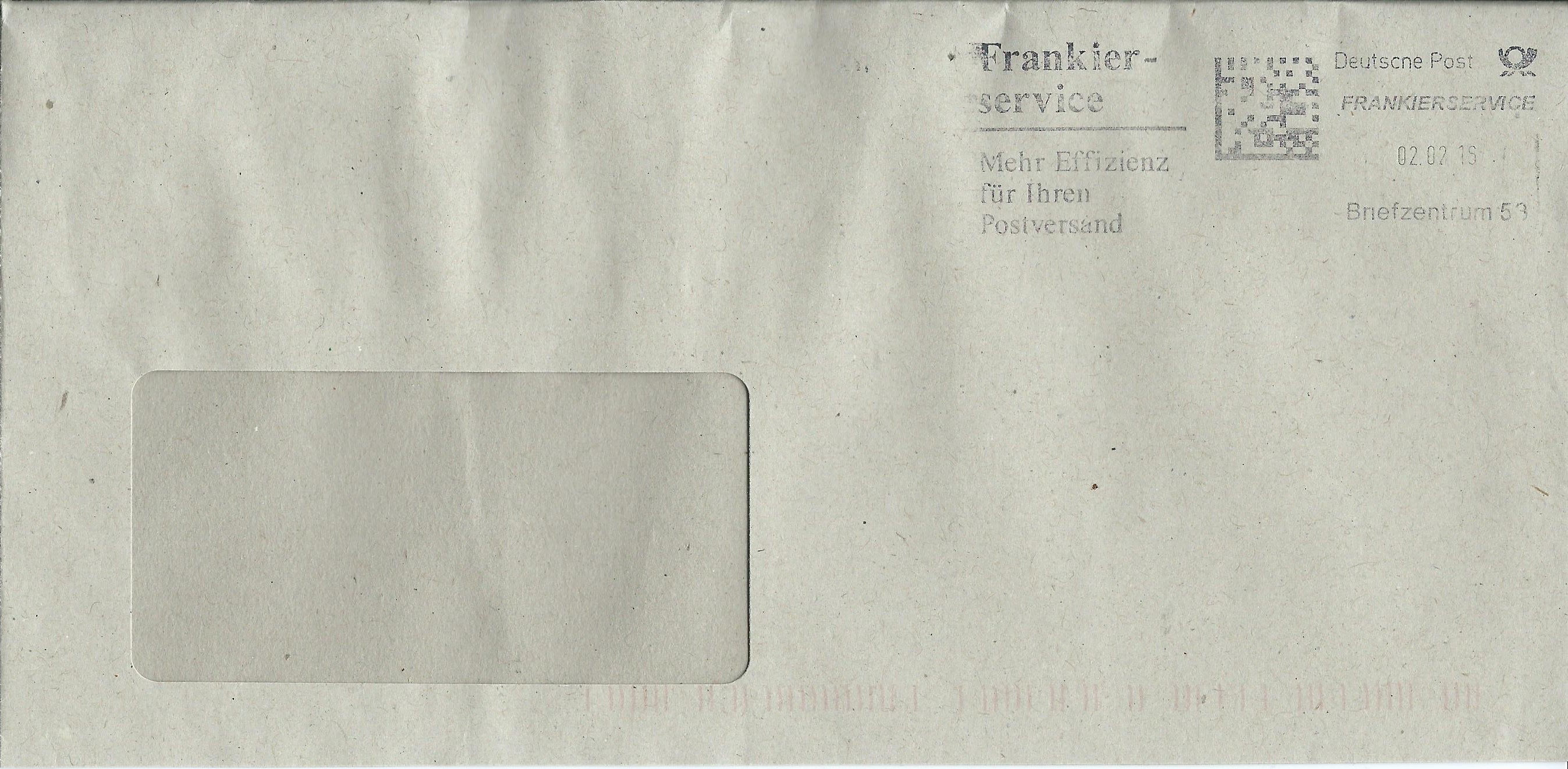 in einem Belegehaufen gefunden: Ein Beleg Frankierservice vom Briefzentrum 53 vom 2.2.15 mit Eigenwerbung: