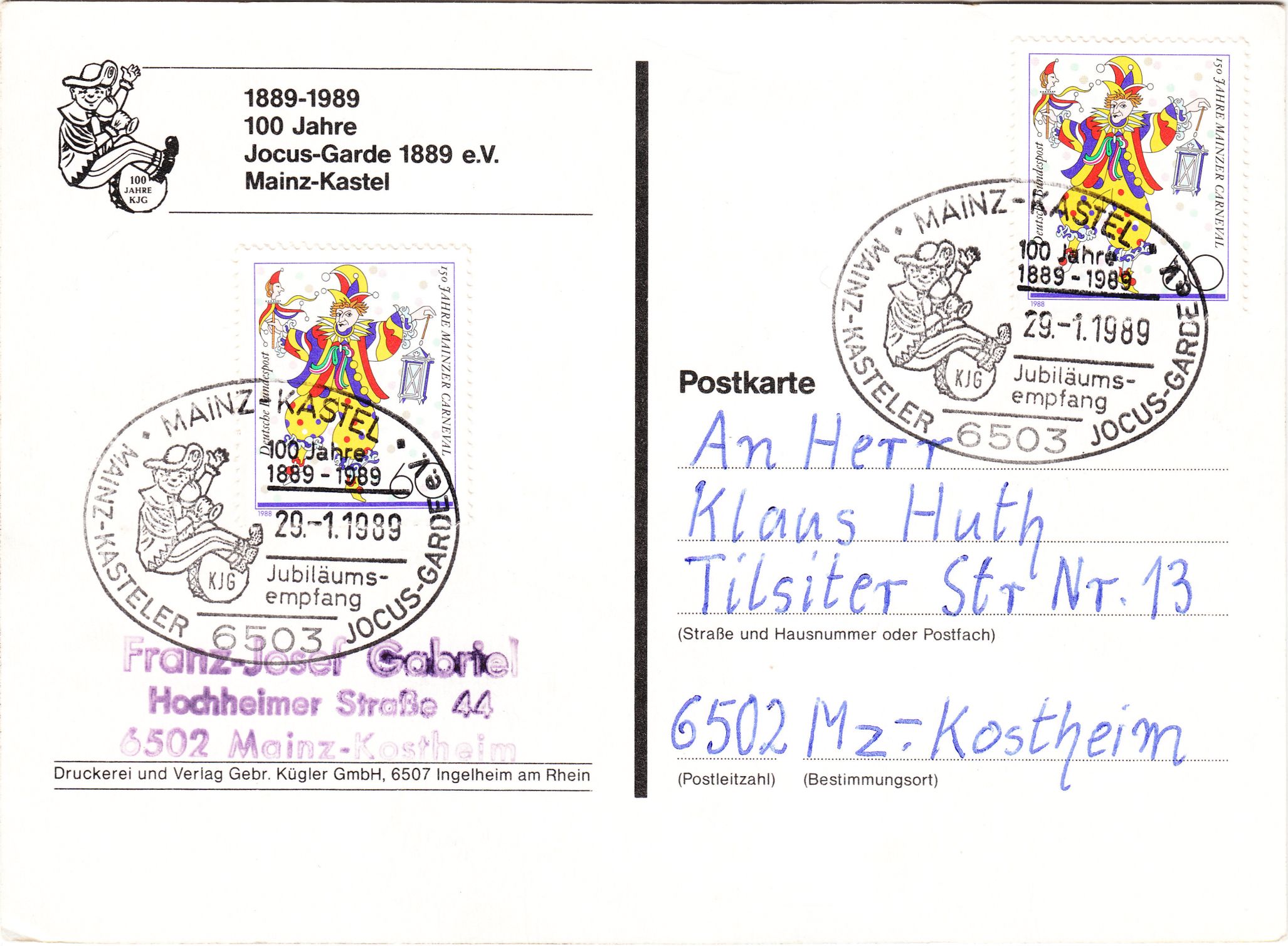 Dieser Sonderstempel wurde am 29.01.1989 zum Jubiläumsempfang der Jocus-Garde in Mainz eingesetzt:
