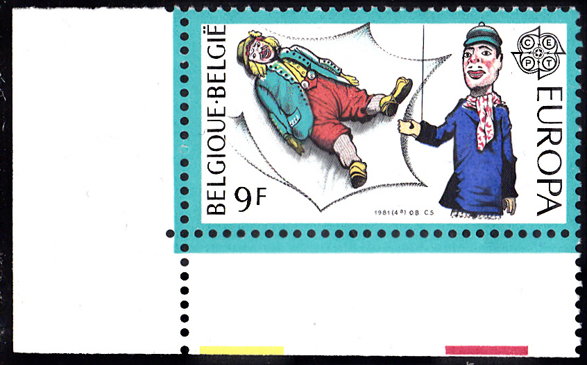 In Belgien erschienen die Europamarken 1981 zum Gemeinschaftsthema "Folklore" am 2. Mai 1981. Hier ein Eckrandstück der Marke zu 9 Francs mit Farbrandstreifen mit der Abbildung der Puppen "Opsinjoorke" und "Tchantchès". Die Auflage betrug 10 000 000 Stück.