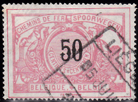 Diese Eisenbahnpaketmarke der Wertstufe zu 50 Centimes wurde als MiNr. 19 katalogisiert, hier ein mit Bahnstempel entwertetes Exemplar: