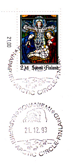 Der Entwertungsstempel stammt aus Napapiiri in Finnland, wo sich das Hauptpostamt des Weihnachtsmannes befindet, siehe hier: