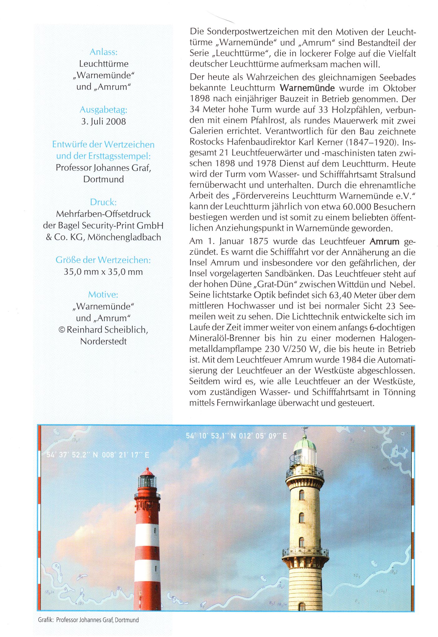 Dieses Ersttagsblatt = ETB vom 03.07.2008 bietet einige Detailinformationen zu den Leuchttürmen in Warnemünde sowie Amrum: