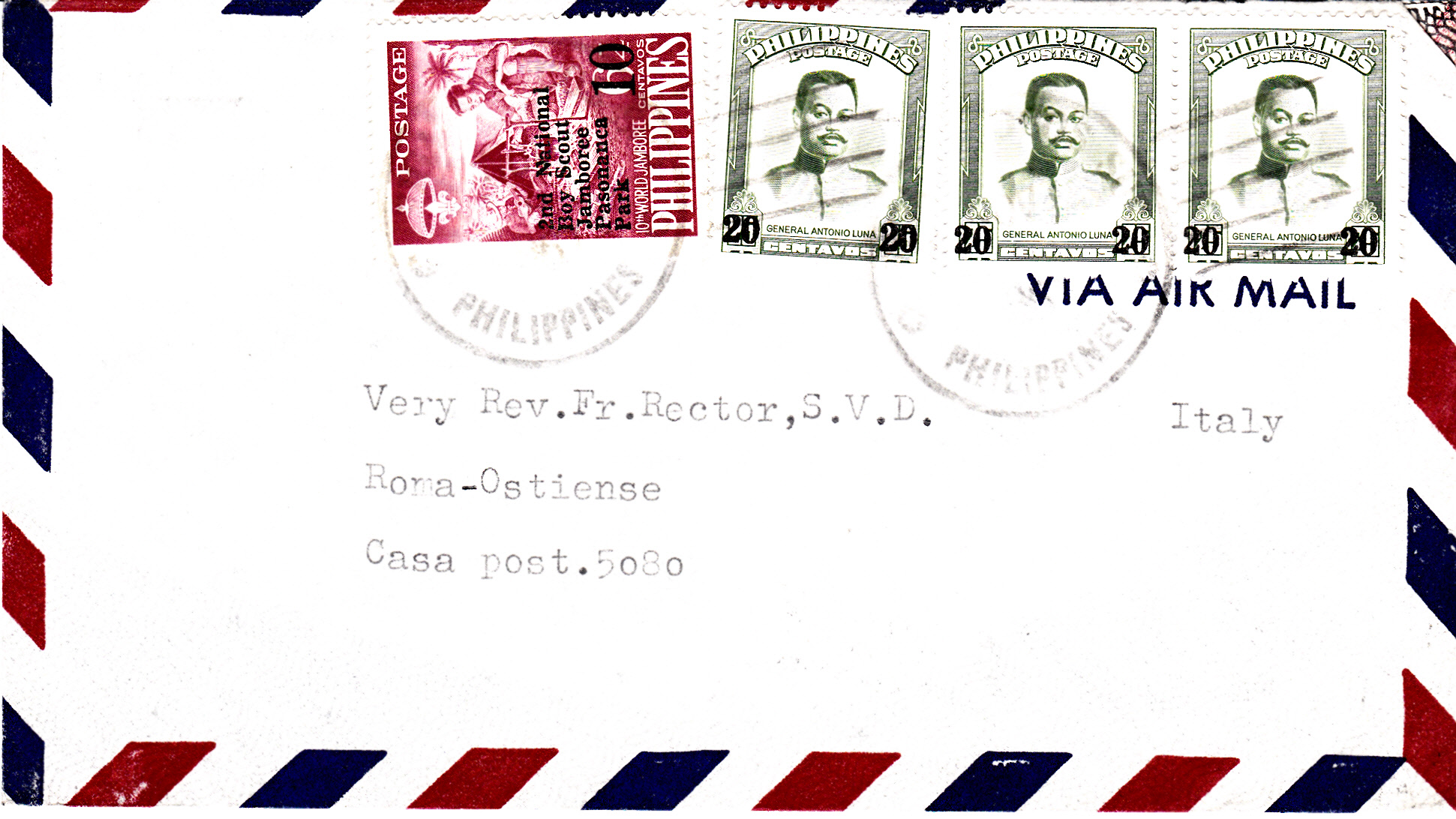 Luftpostbrief aus den Philippinen nach Rom. Zur Frankatur wurden drei Freimarkenprovisorien 20 C auf 25 C (MiNr 663 Urmarke war MiNr 553) und eine Marke zum Nationalen Pfadfindertreffen im Pasonanca Park (MiNr 673 y). Auch diese Marke ist eine Marke mit Aufdruck. Die ursprüngliche Marke (MiNr 634 y) war zum 10. Pfadfinder-Treffen im Makiling National Park erschienen. Die Marke ist auf gelblichem Papier gedruckt, es gibt sie auch auf weißem Papier (MiNr 673 x). Auf der Rückseite des Briefes befinden sich Ankunftsstempel aus Rom.
