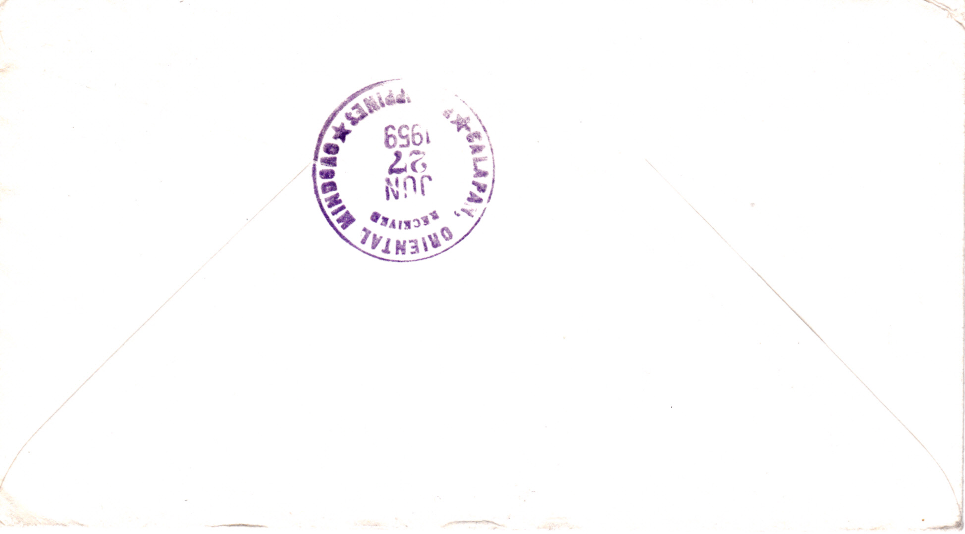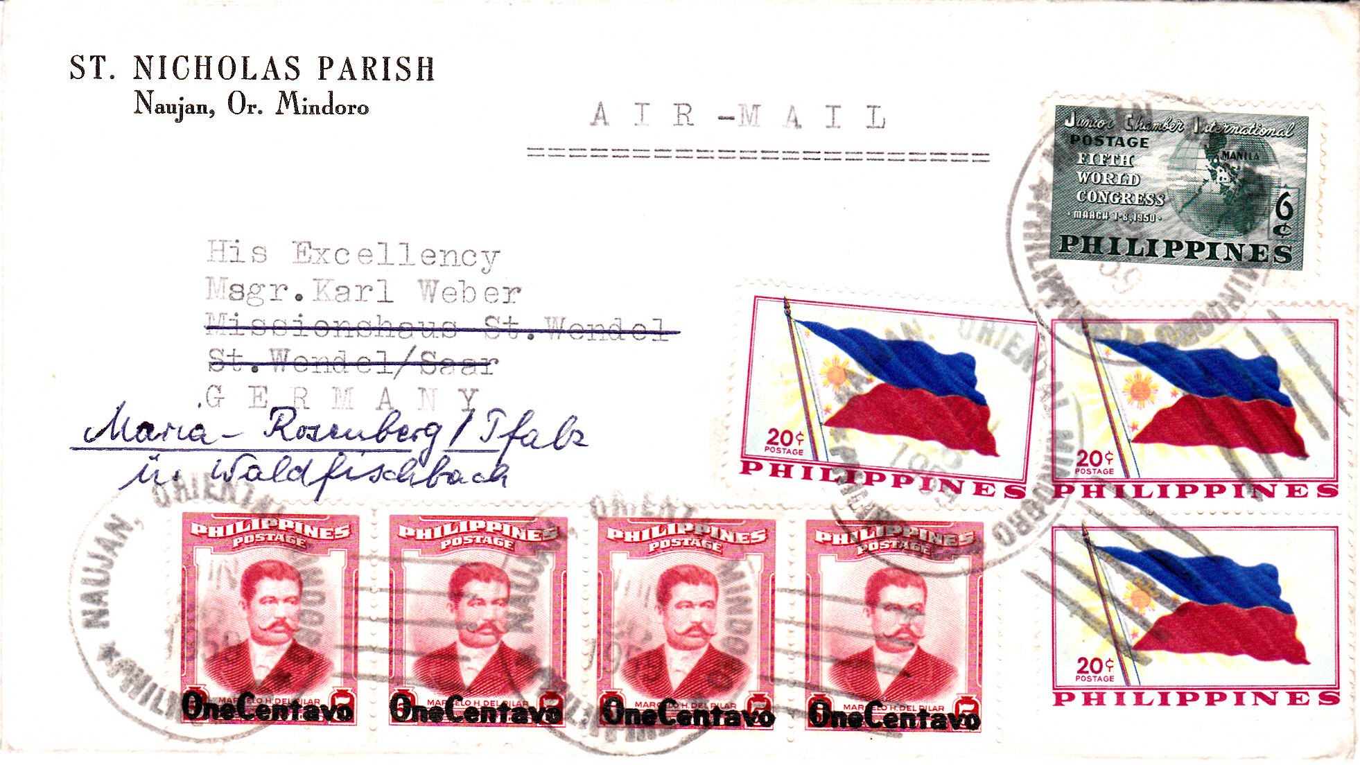 Luftpostbrief von Naujan nach St. Wendel (Saar) vom 26.6.1959. Der Brief wurde nach Ankunft in St. Wendel nach Waldfischbach weitergeschickt. Zur Frankatur wurde folgende Marken verwendet: Die Marke zu 6c zum 5. Weltkongress der Internationalen Junioren-Handelskammer in Manila aus dem Jahre 1950 (MiNr 502), drei Marken zu 20c "60 Jahre Nationalflagge" (MiNr 626) und vier Marken mit Aufdruck "one Centavo" (MiNr 623). Rückseitig befindet sich ein Durchgangsstempel.